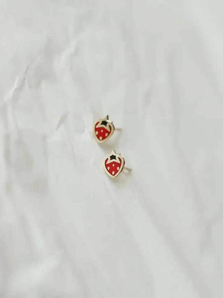 Venta al por mayor 9K oro de moda Stud pendientes encantador rojo fresa Mini japonés coreano fruta diseño IGI certificado Earbone cuarzo