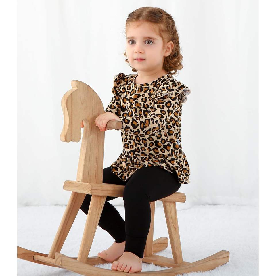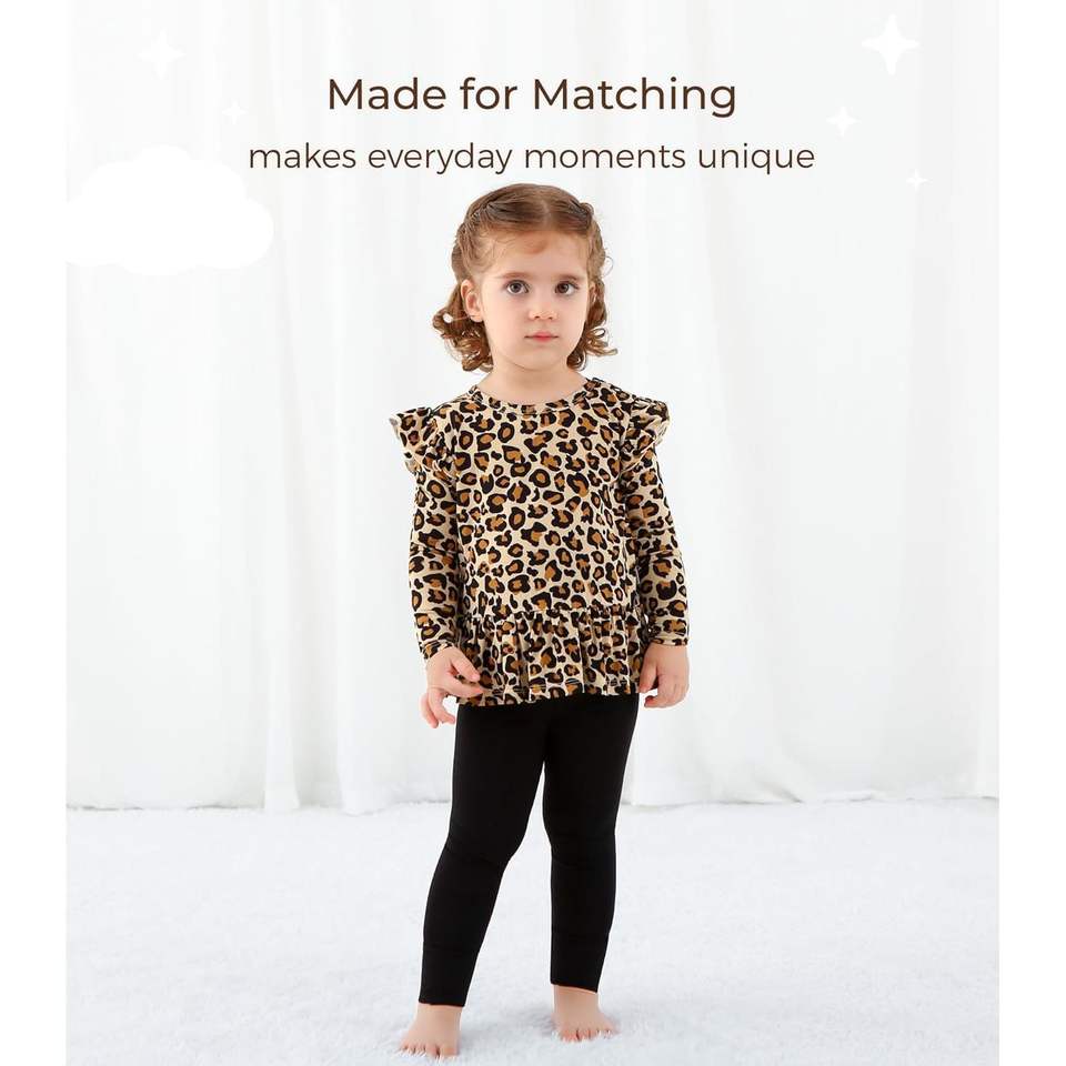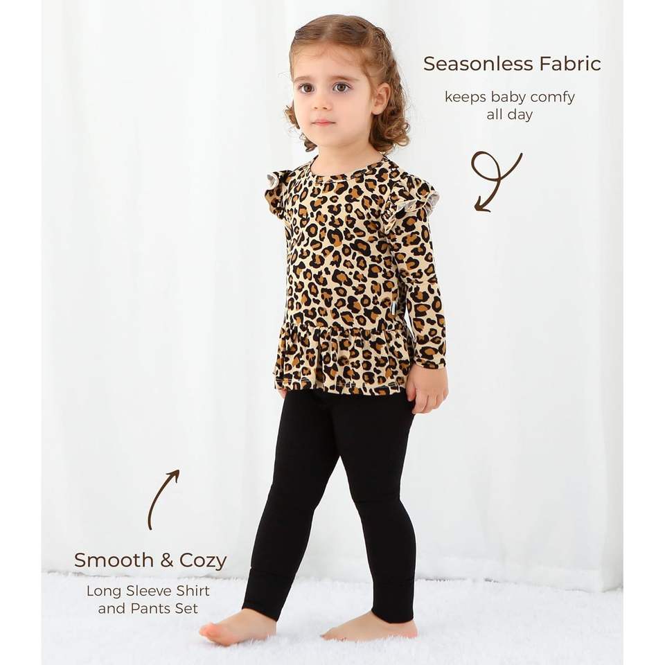 Conjunto de Ropa para Bebés Niñas al por Mayor, Top de Manga Larga con Estampado de Leopardo y Volantes, con Pantalones Negros, Ropa Transpirable de Algodón y Fibra de Bambú