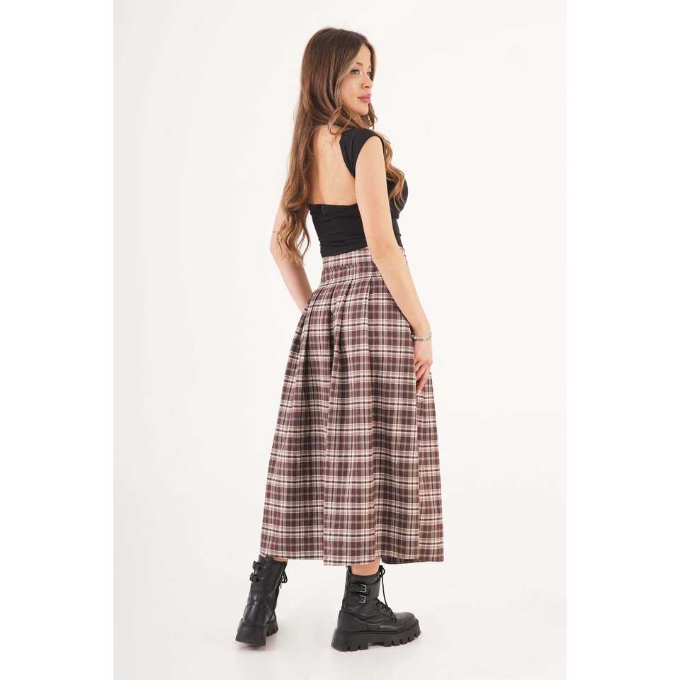 Falda Cruzada con Pliegues y Estampado a Cuadros Marrones al por Mayor, con Detalle de Cinturón y Aberturas Laterales, Tela Vaquera, Estilo Liso
