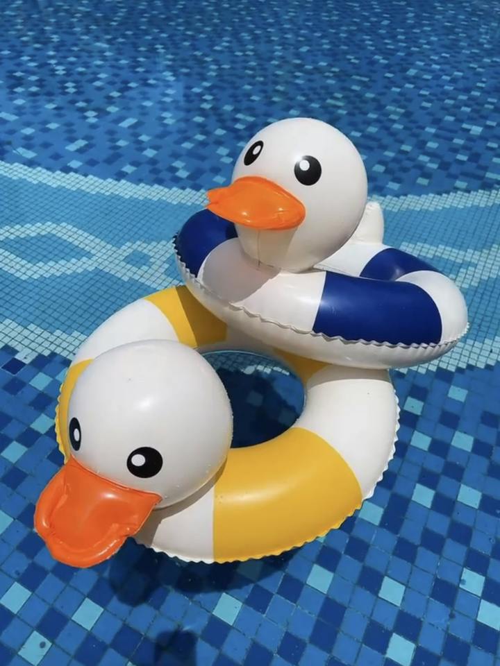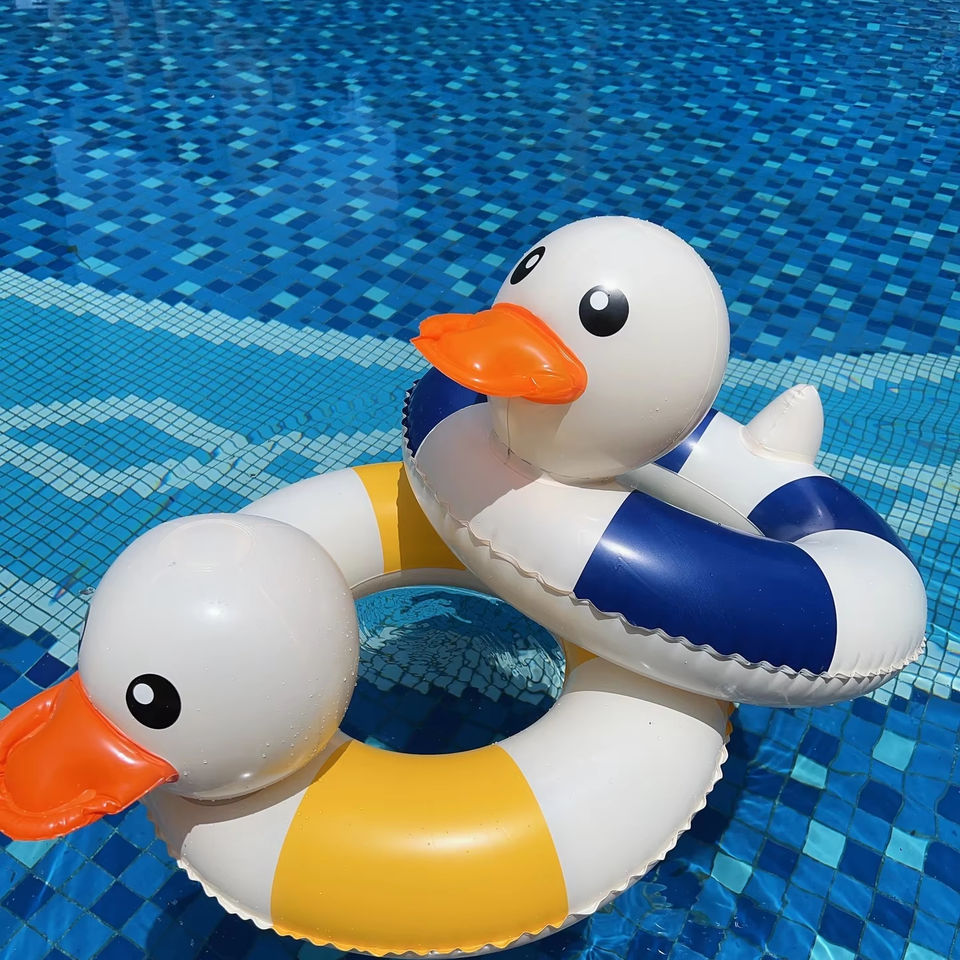 Anillo de Natación Inflable al por Mayor para Niños, Diseño de Pato Flotante para Piscina con Círculos Azules y Amarillos, Material de PVC