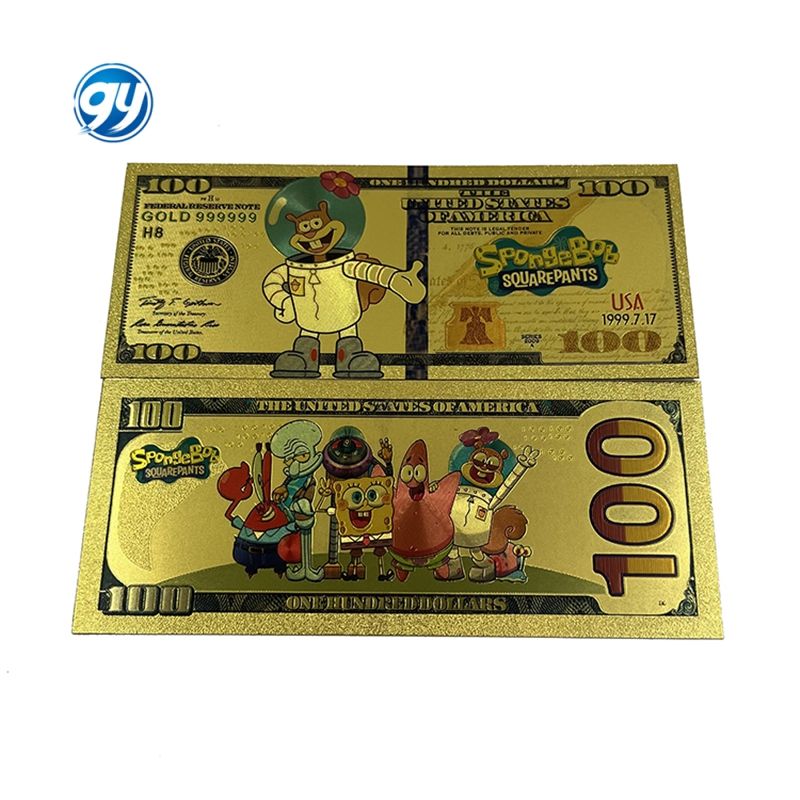 Billete de Banco de Plástico Chapado en Oro de 24k con Diseño de Bob Esponja, Anime de Dibujos Animados, Venta al por Mayor