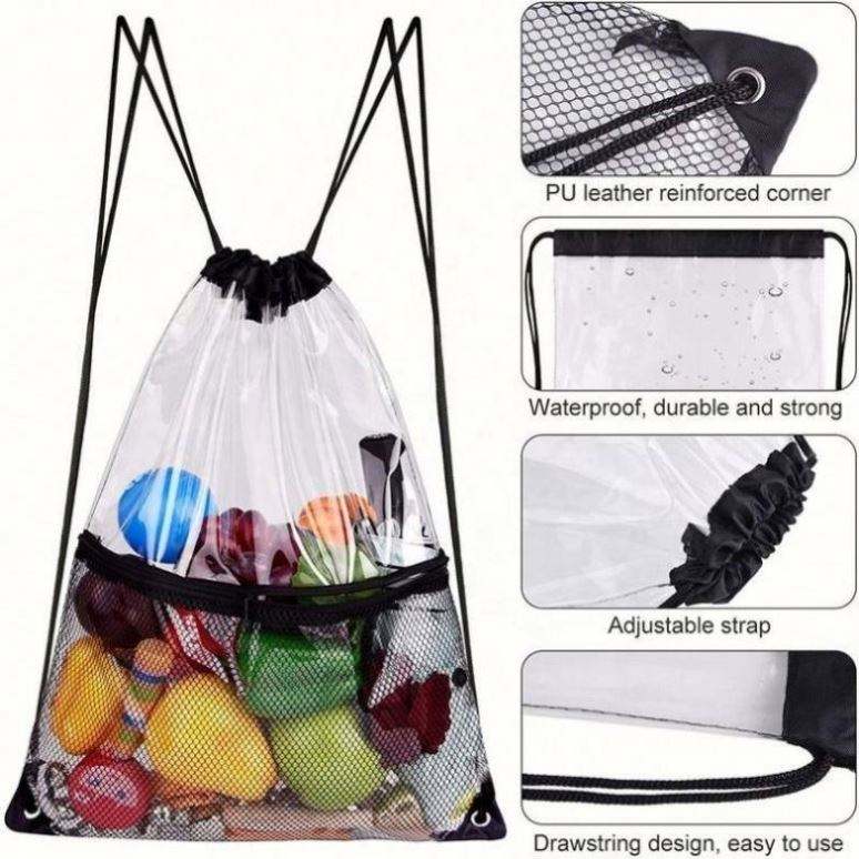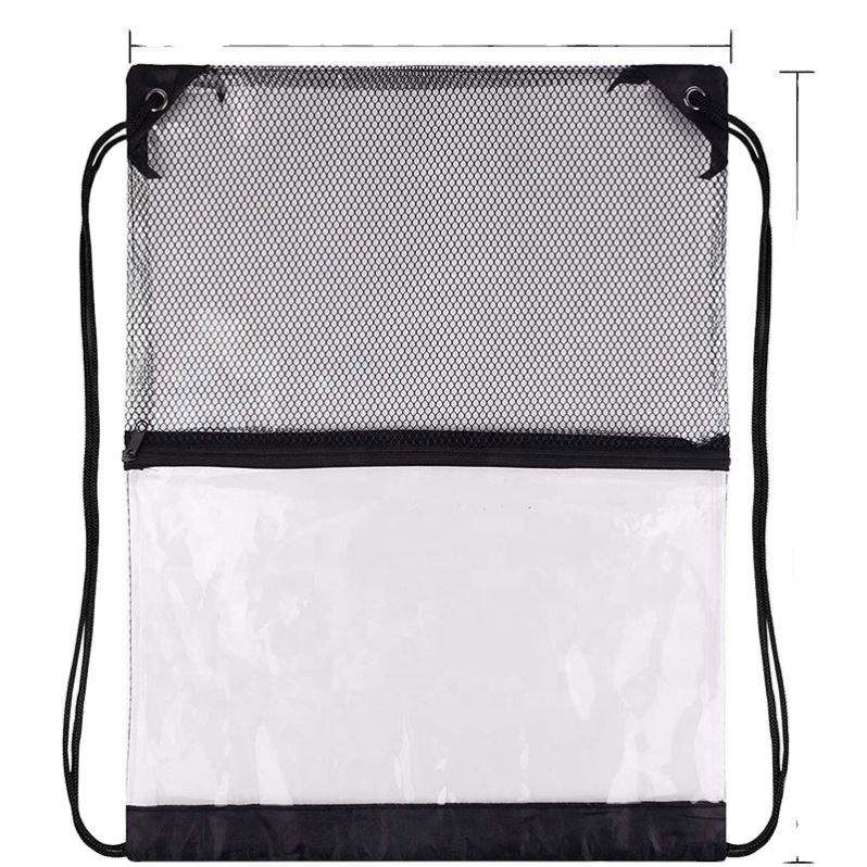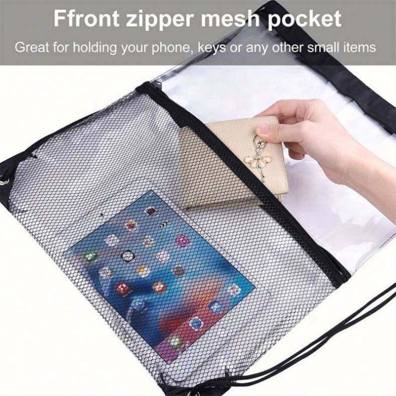 Mochila de Gimnasio con Cordón de PVC, Personalizada con Logotipo, Barata al por Mayor, Transparente, Impermeable, con Bolsillo de Malla y Cierre de Cremallera