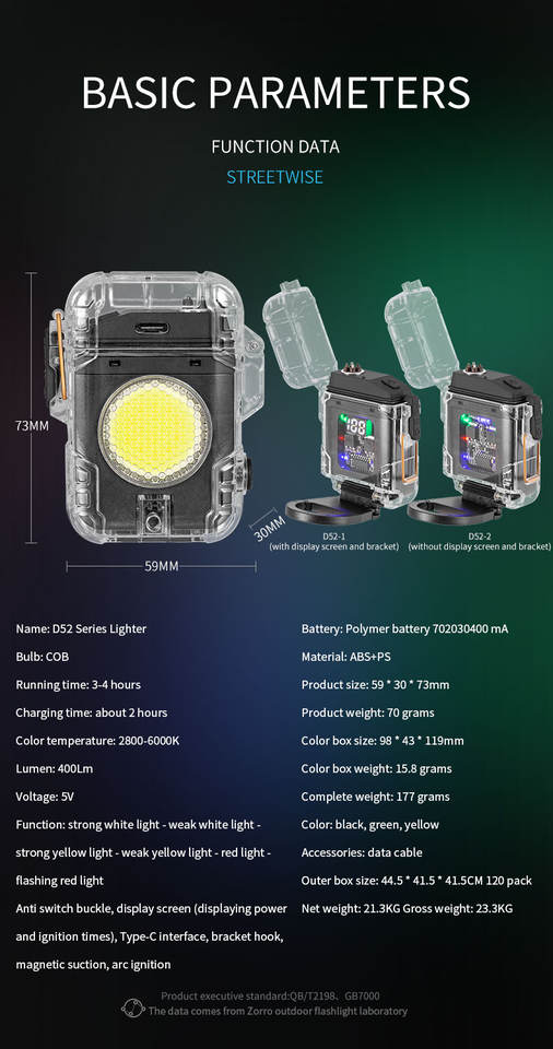 Información del embalaje: encendedor, cable de carga, caja de color.