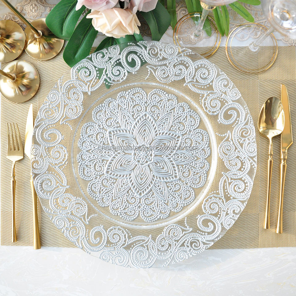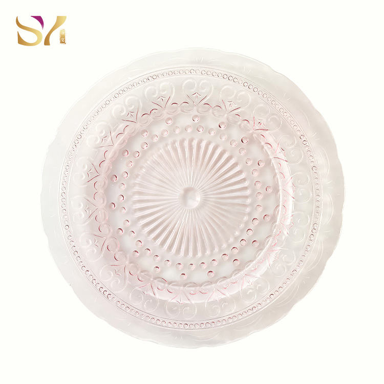 Platos de Presentación Redondos de Cristal Rosa Grabado, Estilo Vintage, Ecológicos, de 13 Pulgadas, para Bodas, Venta al Por Mayor