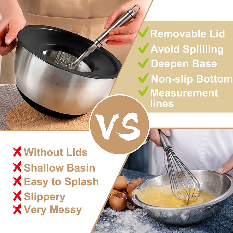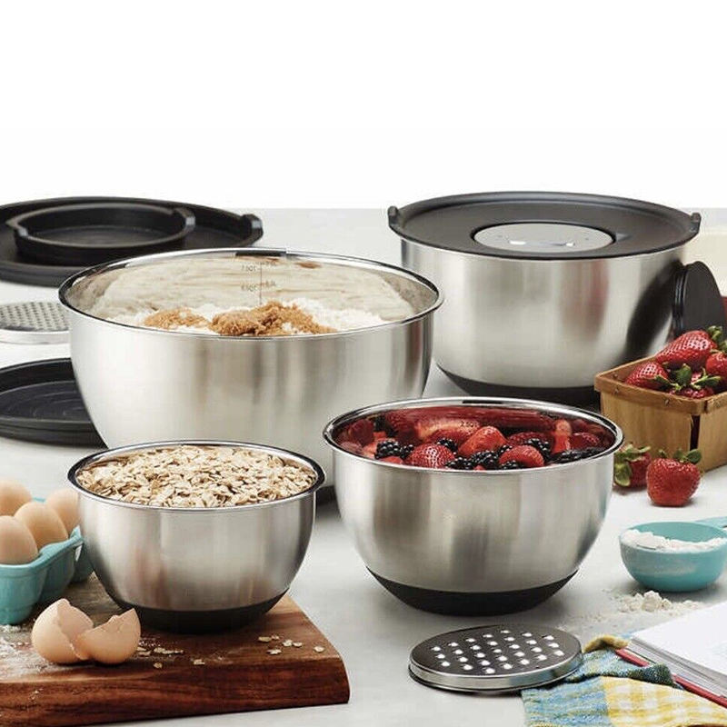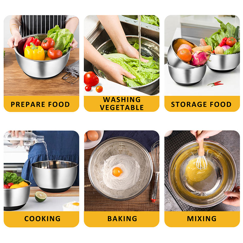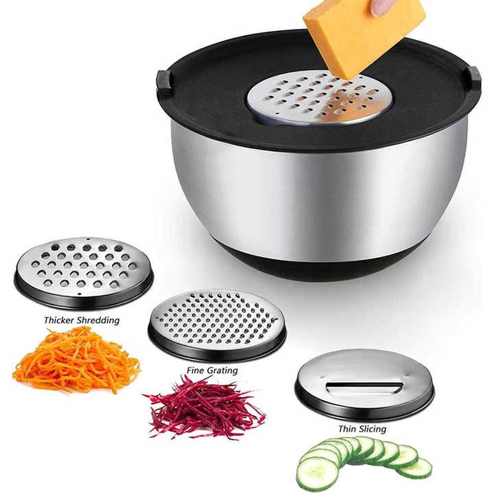 Juego de 8 piezas personalizado al por mayor cocina fondo antideslizante tazón para ensaladas y verduras juego de tazón de acero inoxidable con cepilladora de melón