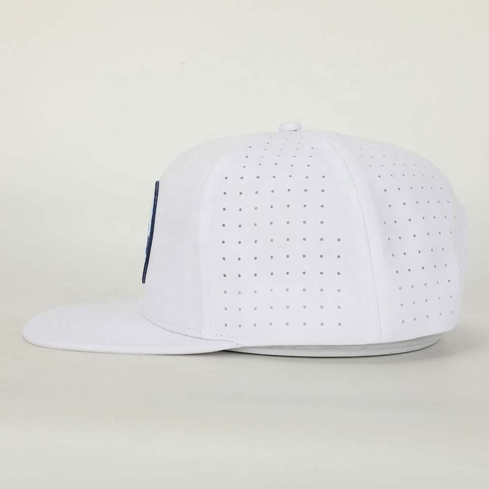 Sombrero de ala plana de 6 paneles de alta calidad con logotipo de parche bordado personalizado al por mayor, gorras de poliéster blanco con agujeros cortados con láser, gorra Snapback