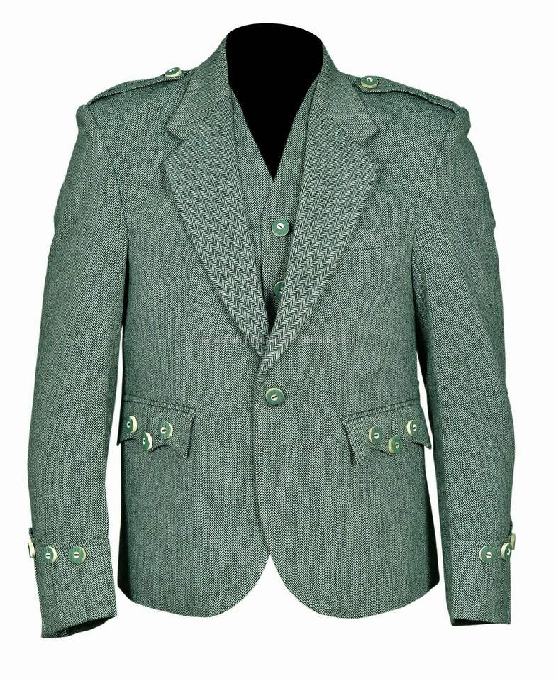 Chaqueta Escocesa Verde Personalizada al por Mayor con Chaleco de 5 Botones, Traje de Boda Escocés, Chaquetas para Hombre