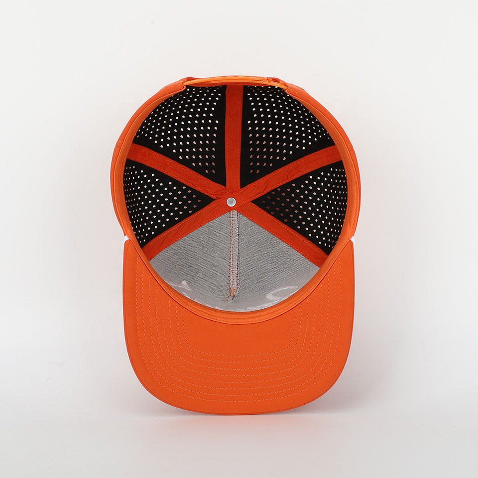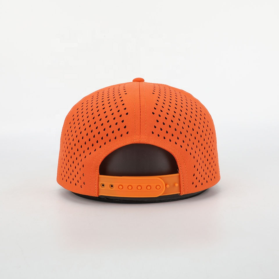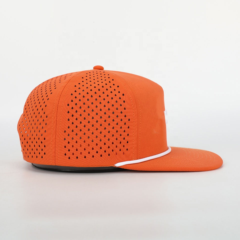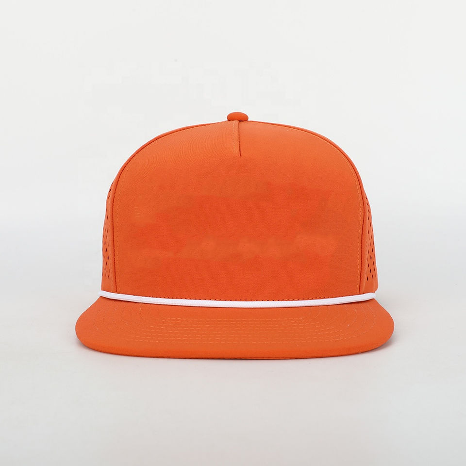 Gorro de poliéster con logotipo bordado de alta calidad personalizado al por mayor, Gorras de ala plana con agujero cortado a láser de 5 paneles, gorra Snapback impermeable con cuerda