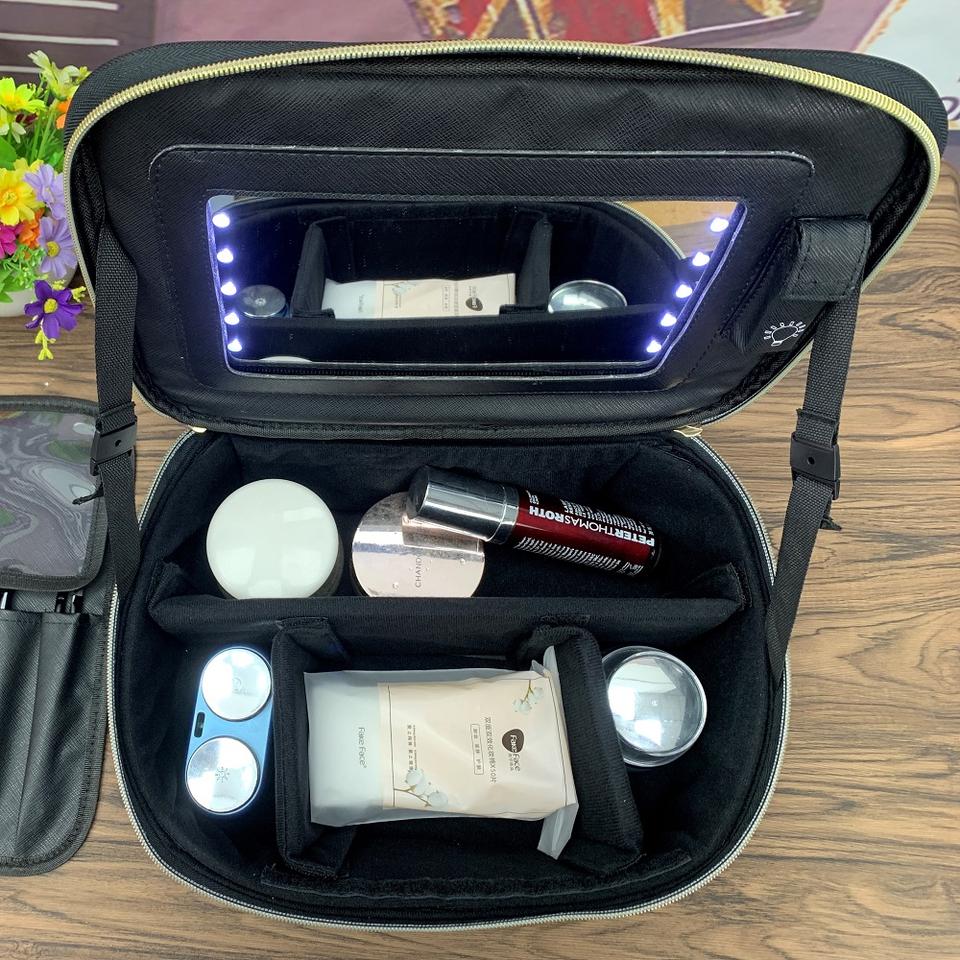 Neceser de viaje con logotipo personalizado, bolsa de maquillaje de poliéster/PU con espejo LED blanco, venta al por mayor