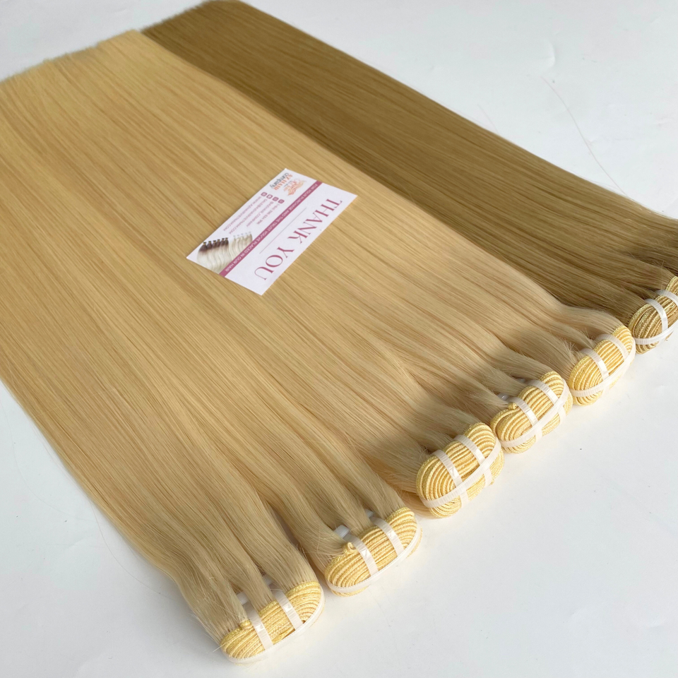 Venta al por mayor de extensiones de cabello de trama de máquina doble de mano suave de longitud personalizada mechones de cabello humano rubio claro materia prima vietnamita