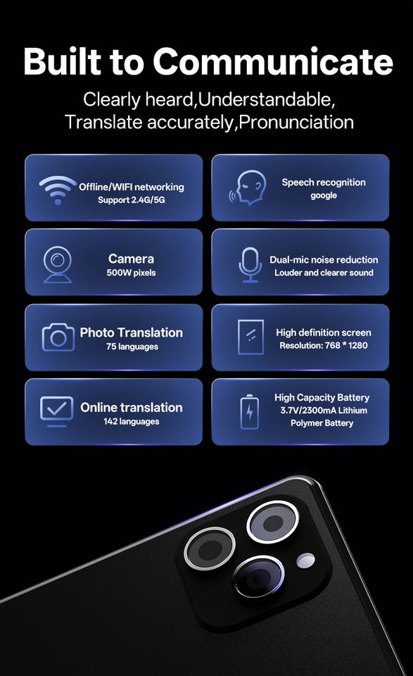 Wifi, 5g, Traducción de idiomas, Traducción de voz, Altavoz incorporado, Intelligent recordingCaracterística