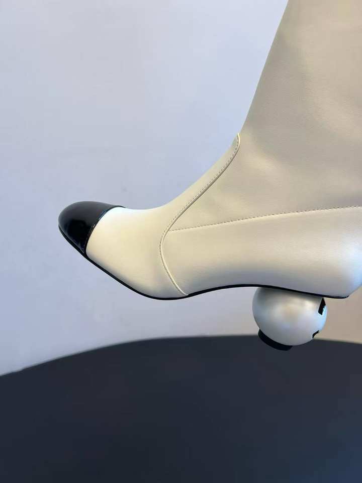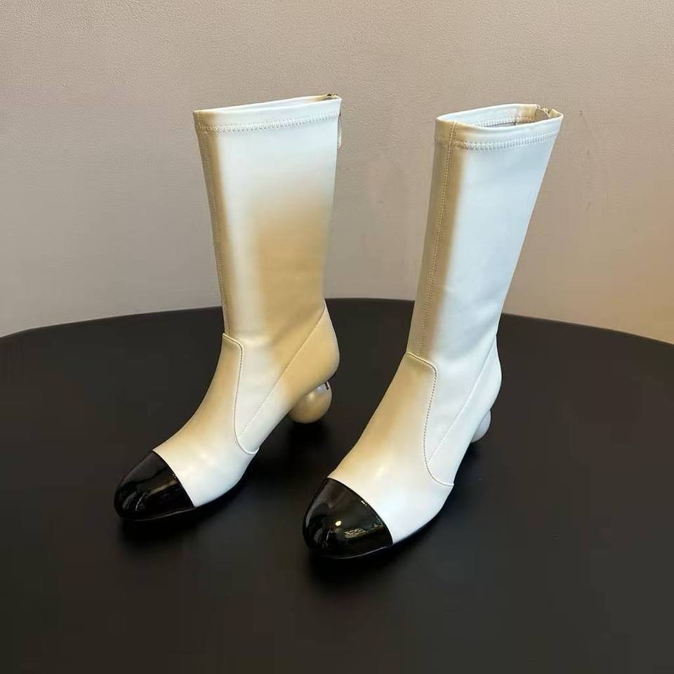 Botas de Mujer al por Mayor con Logotipo Personalizado, Diseño Colorblock, Perlas, Cuero Genuino, Invierno, Otoño, Cierre de Cremallera, Tacón Grueso, Aumento de Altura, Media Pantorrilla, Formales