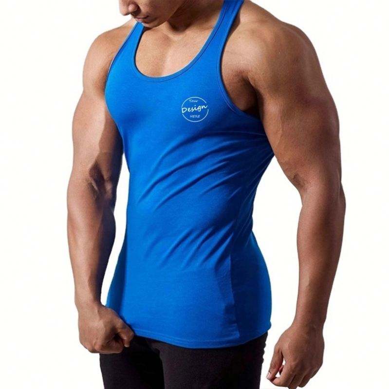 Camiseta sin mangas de punto transpirable con estampado Digital de logotipo personalizado al por mayor para hombre, camiseta azul ajustada suave de secado rápido 100% algodón