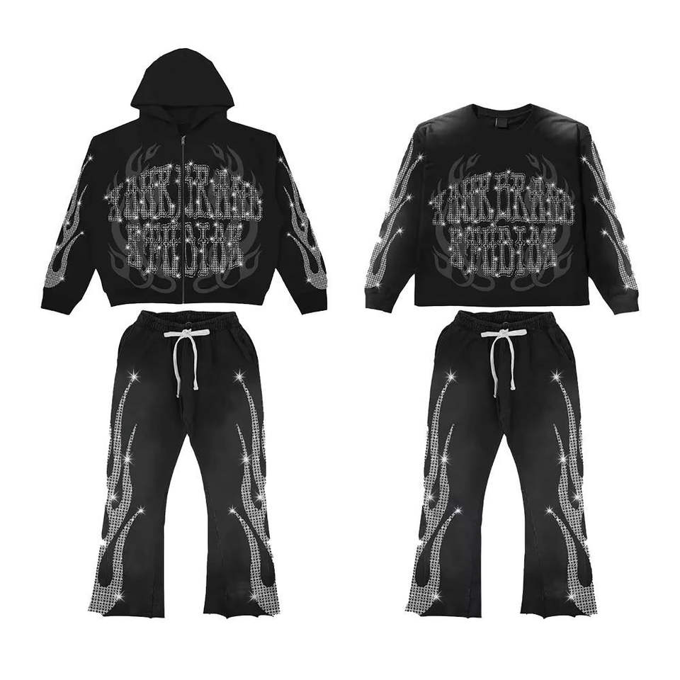 Conjunto Deportivo Casual de 2 Piezas con Logotipo Personalizado, Estilo Y2K, Sudadera Oversize con Pedrería y Pantalones Acampanados de Algodón Grueso, Unisex, Venta al Por Mayor