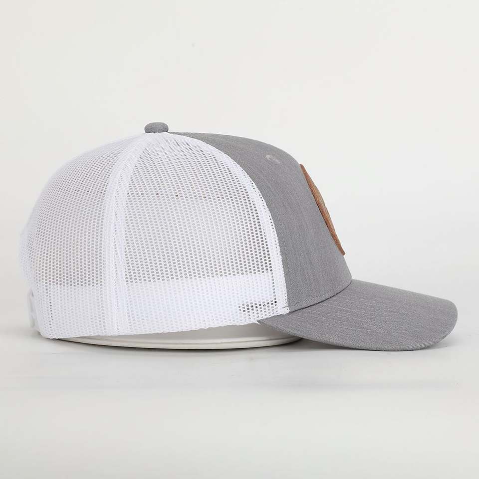 Venta al por mayor de gorras lisas de 6 paneles de cuero de alta calidad con parche de malla de ala curva para hombre gorra de camionero gris jaspeado 112