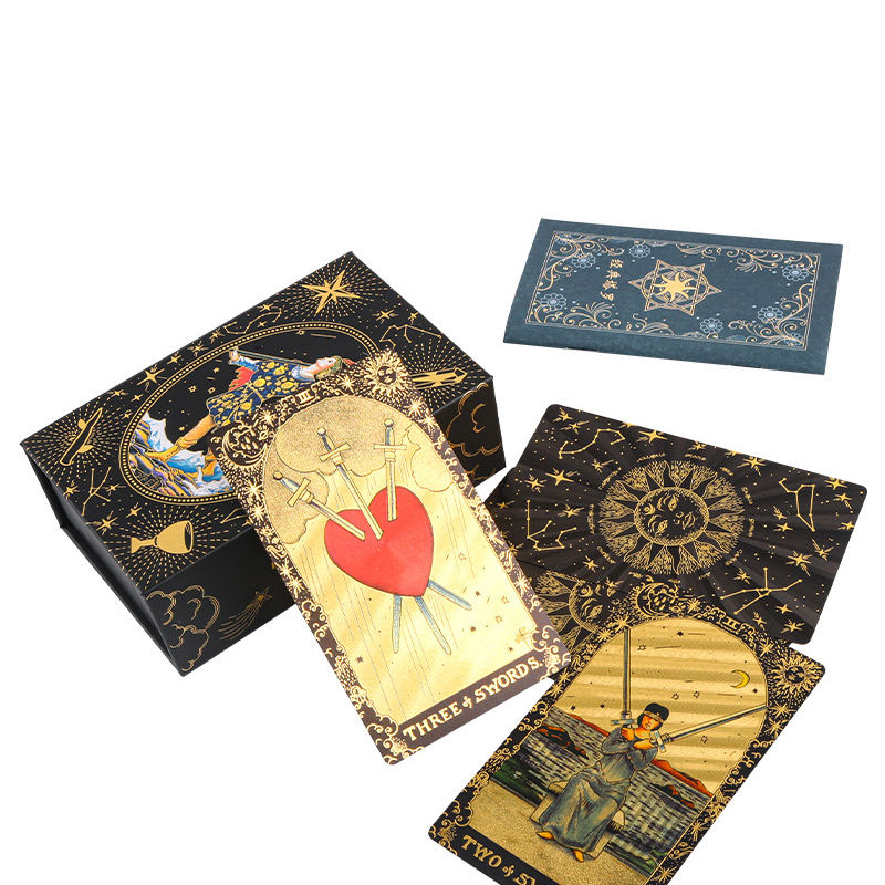 Venta al por mayor de cartas de Tarot impermeables de PVC personalizadas, modelo de universo sol dorado negro con Manual de usuario, naipes duraderos