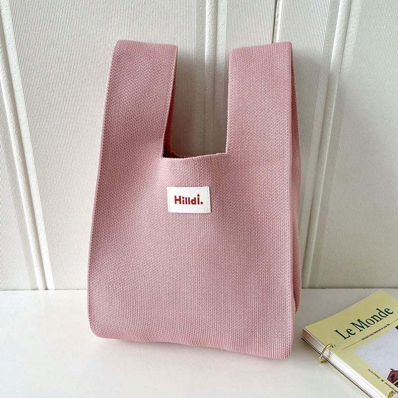 Bolso de mano de punto Macron colorido con logo impreso personalizado al por mayor, bolso tote de punto de color sólido para muñeca