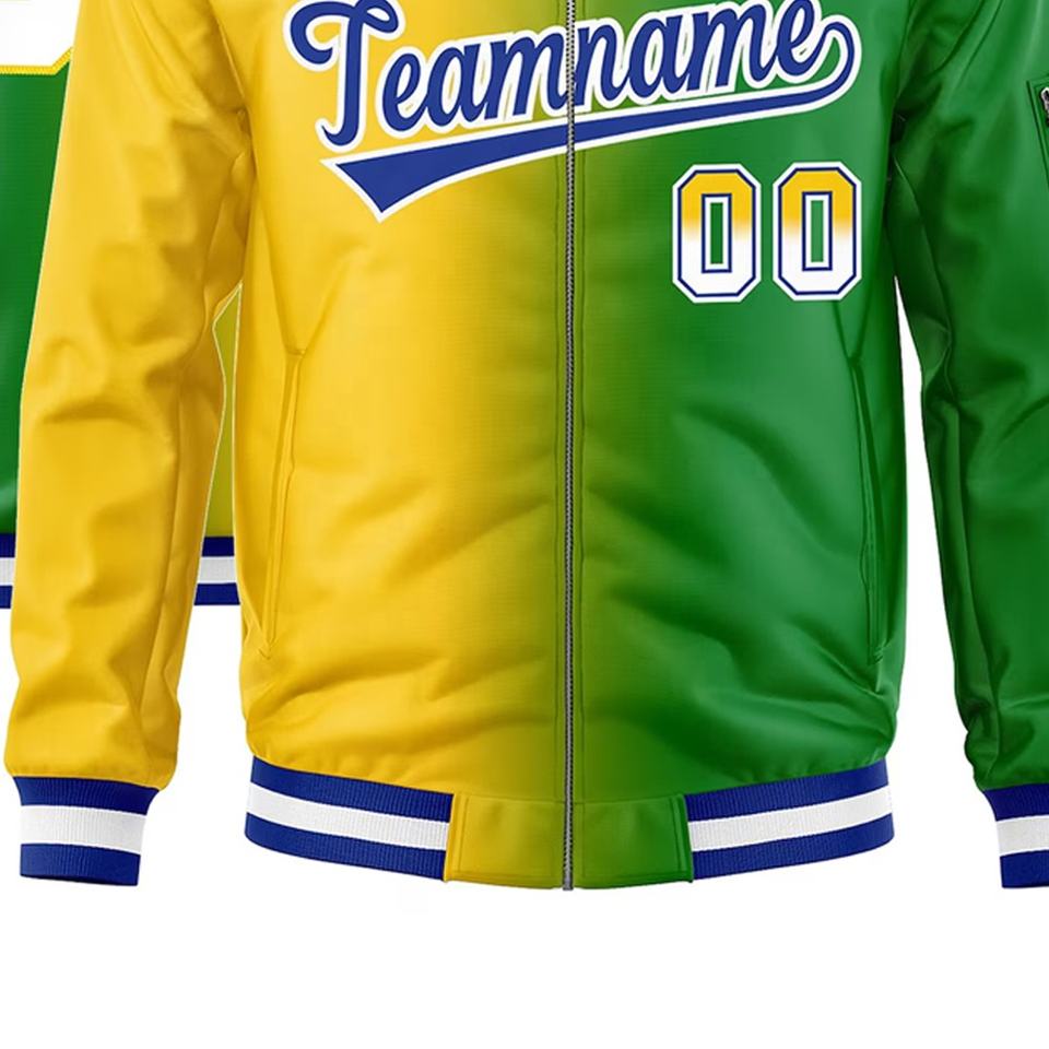 Chaqueta Bomber Universitaria Personalizada al por Mayor, Dos Tonos Verde y Amarillo, Bordado Softshell con Nombre del Equipo, Sin Protección UV, Transpirable para Invierno