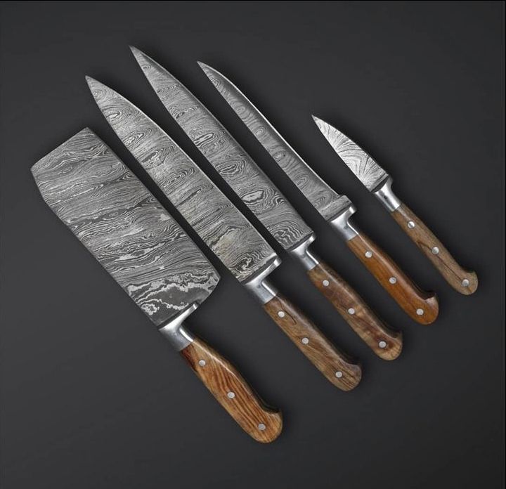 Venta al por mayor personalizado OEM ODM PRESTIGE BLADES hecho a mano Damasco acero Chef cuchillo conjunto diseño ambidiestro 5 piezas conjunto de cuchillos