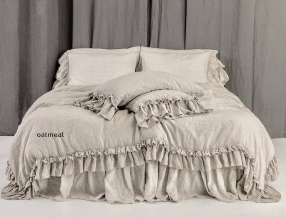 Juego de funda de edredón de lino de estilo rústico personalizado al por mayor, doble volantes, tamaño personalizado, color 200TC, para todas las estaciones, lavable a máquina para el hogar