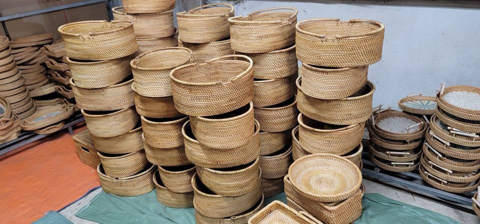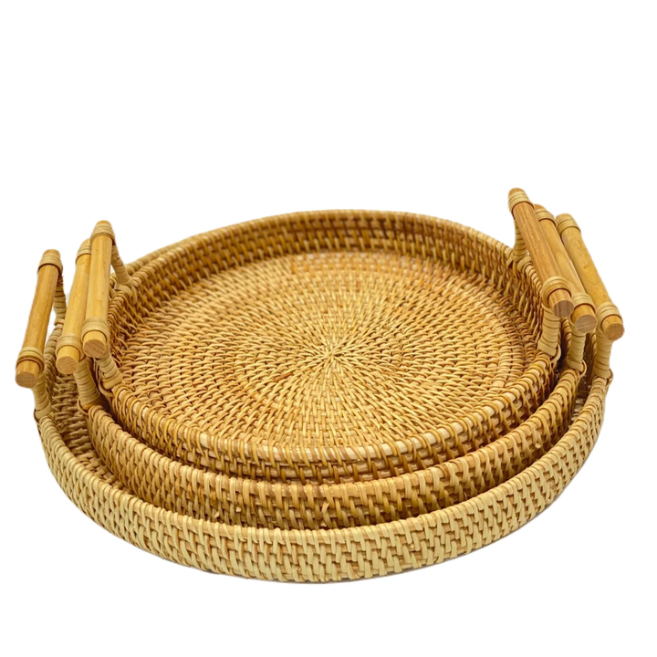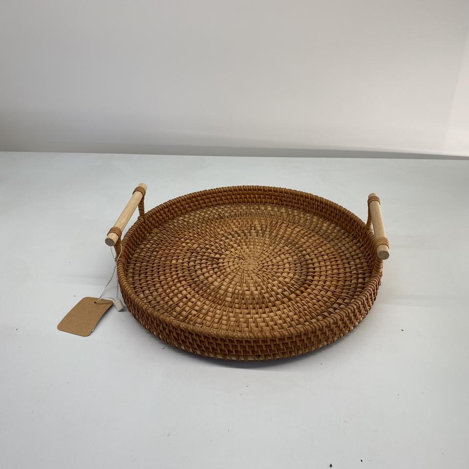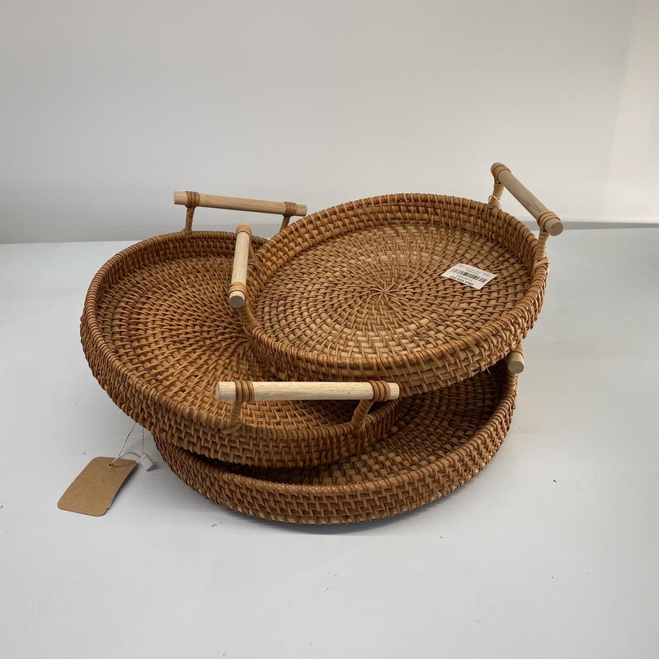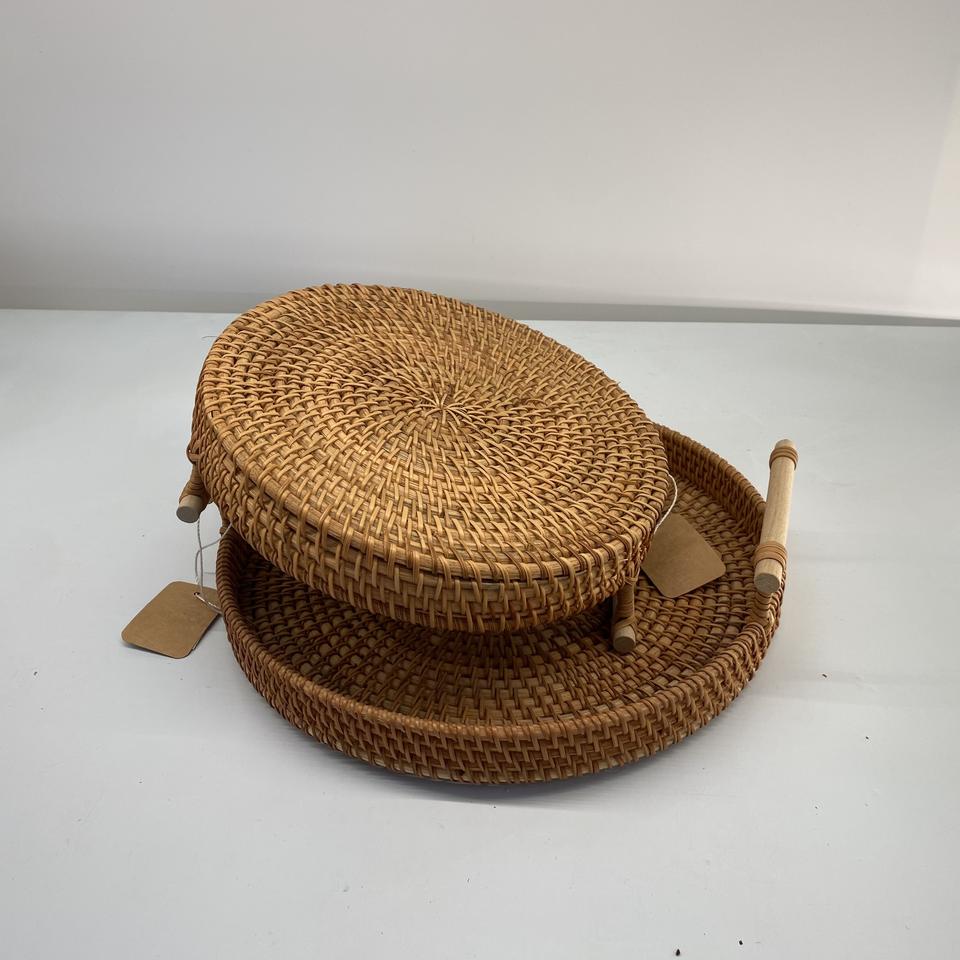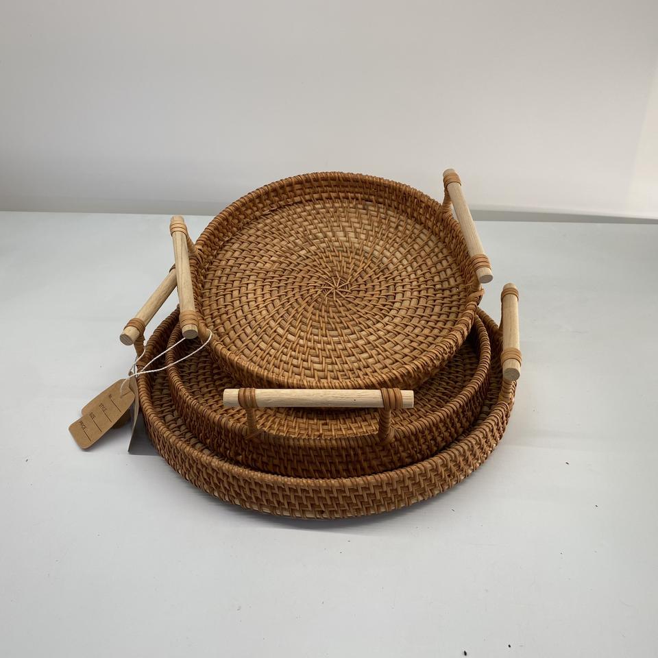 Venta al por mayor de manijas de bandeja de ratán natural de tamaño personalizado modelo básico hecho a mano Vietnam hogar almacenamiento Decoración Comida juguete organización