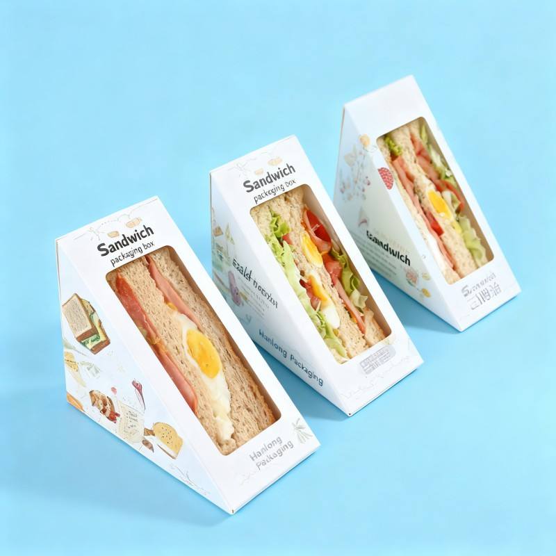 Caja de papel de pícnic triangular personalizada al por mayor, caja de embalaje de comida, panadería, pastel, caja de sándwich biodegradable para llevar con ventana