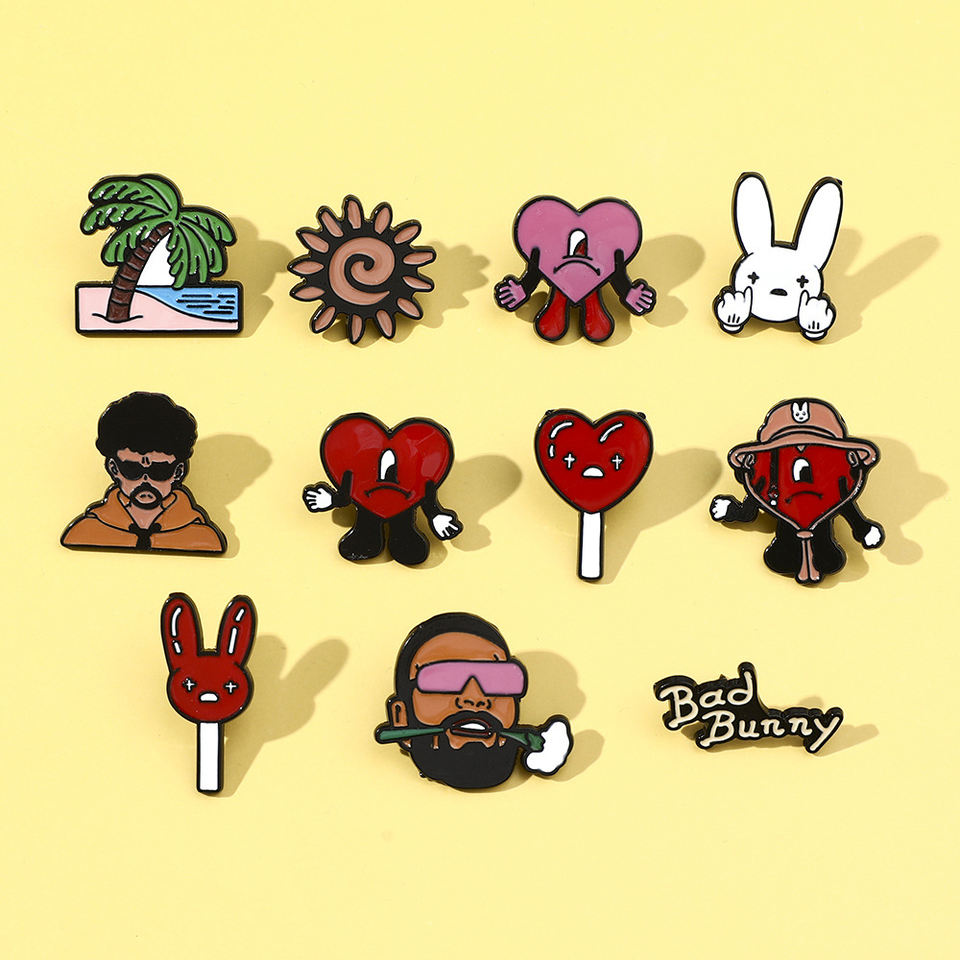 Venta al por mayor lindo rapero de dibujos animados Bad Bunny Metal esmalte broche Bad Rabbit Red Heart Lapel Pins