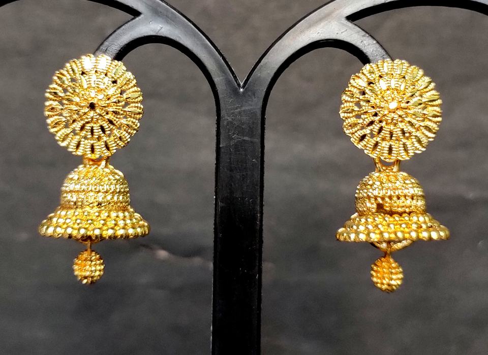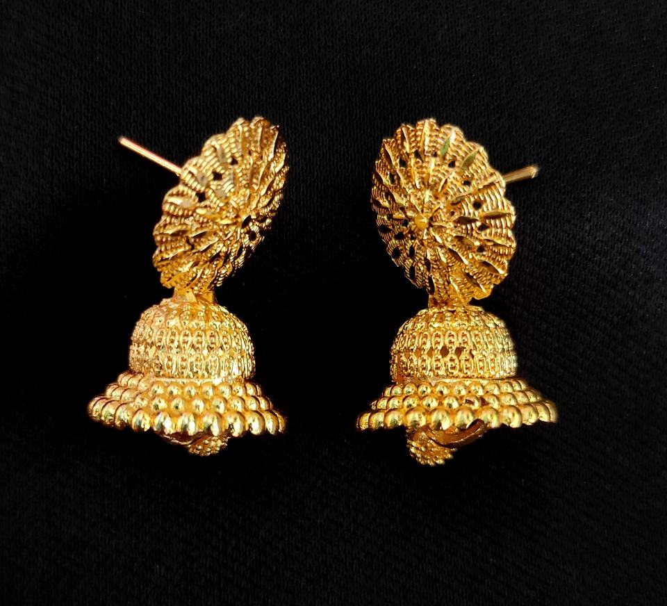 Juego de pendientes al por mayor con diseño tradicional de 22 quilates chapados en oro, pendientes Jhumka, joyería para mujeres, ropa de exportadores