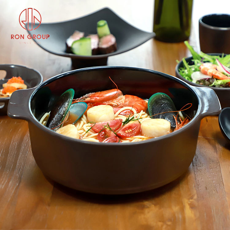 Venta al por mayor de vajilla de melamina ecológica rectangular ébano café negro cena platos cuencos juegos de vajilla platos para