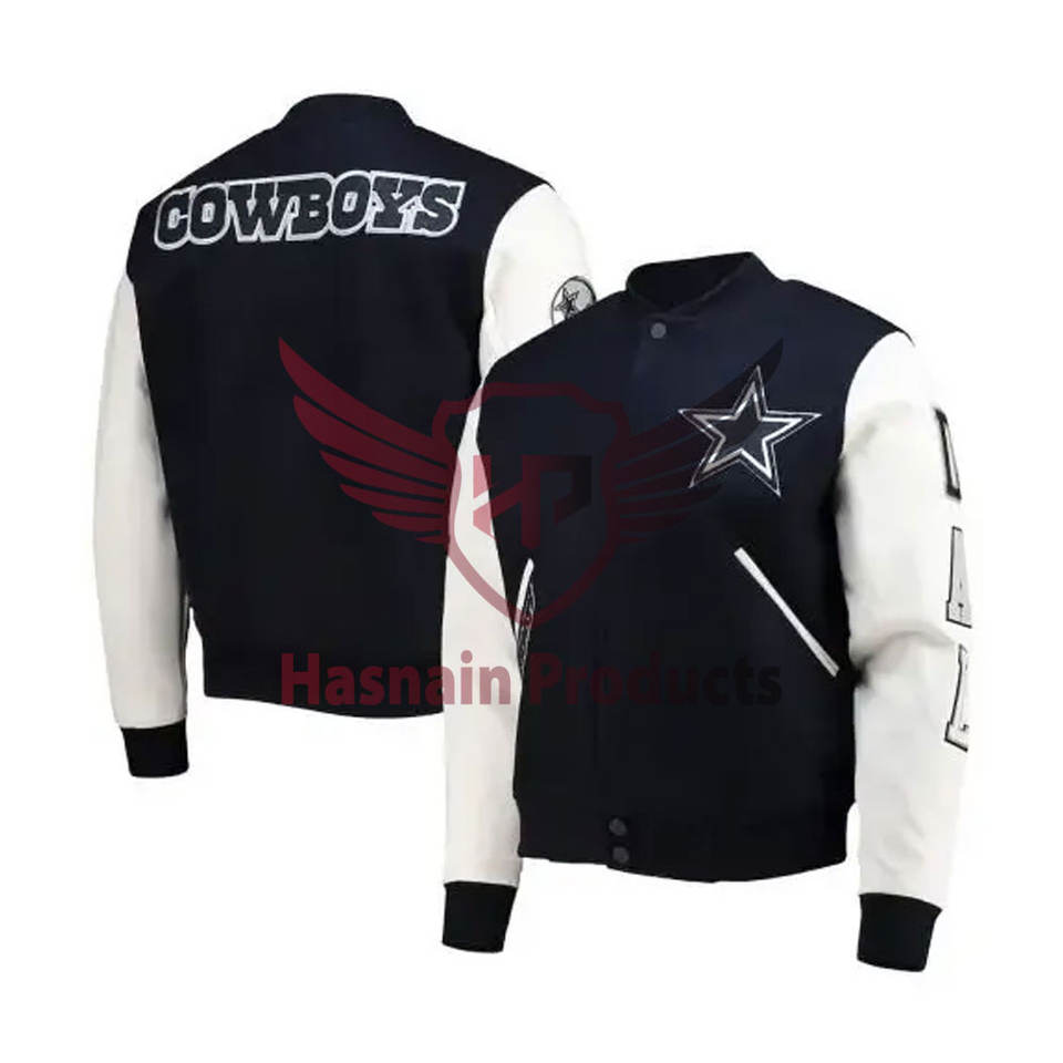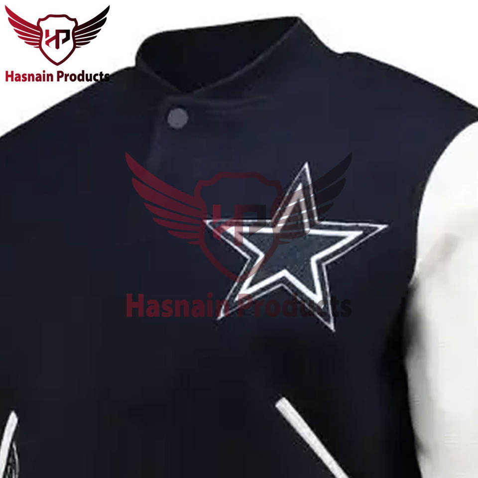 Chaqueta de Béisbol con Logotipo Bordado al por Mayor, Chaqueta Bomber de los Dallas Cowboys, Cuerpo de Lana y Mangas de Cuero, Chaqueta Universitaria