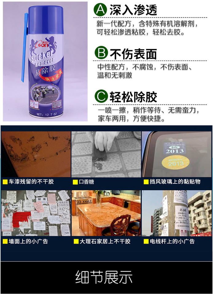 Spray removedor de pegamento y goma de 450 ml para coche y hogar, herramienta quitapelículas, venta al por mayor de fábrica