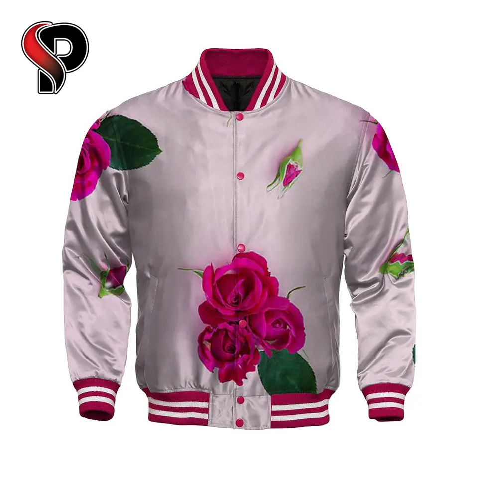 Chaqueta de satén de alta calidad hecha en fábrica al por mayor, chaqueta de bombardero de satén informal para mujer, chaqueta de satén para hombre Letterman Varsity