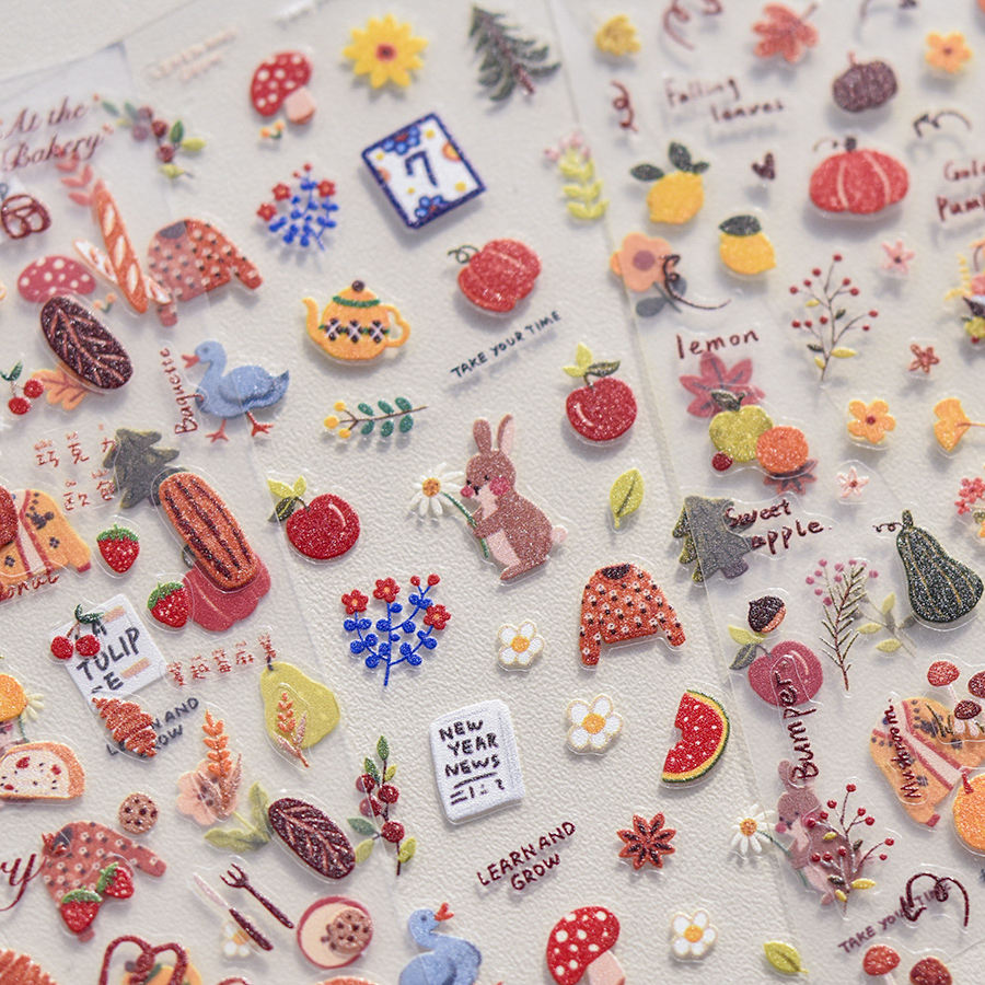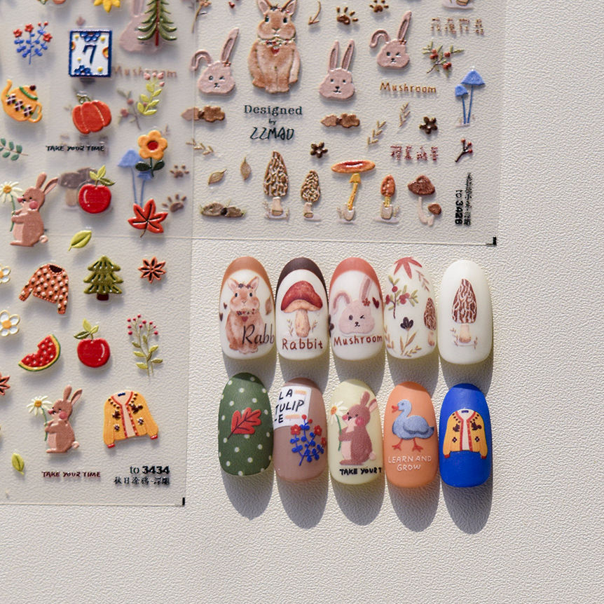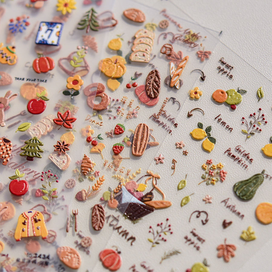 Venta al por mayor de fábrica recién llegado pegatina de uñas autoadhesiva 5d pegatina en relieve otoño lindo dibujos animados dulces pegatinas de uñas