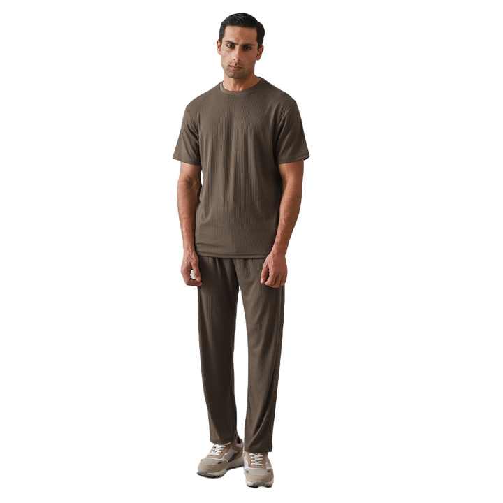 Venta al por mayor de moda de invierno acanalado de punto con capucha sólido chándal marrón oscuro MAXED ENTERPRISES manga larga Top Pantalones rectos