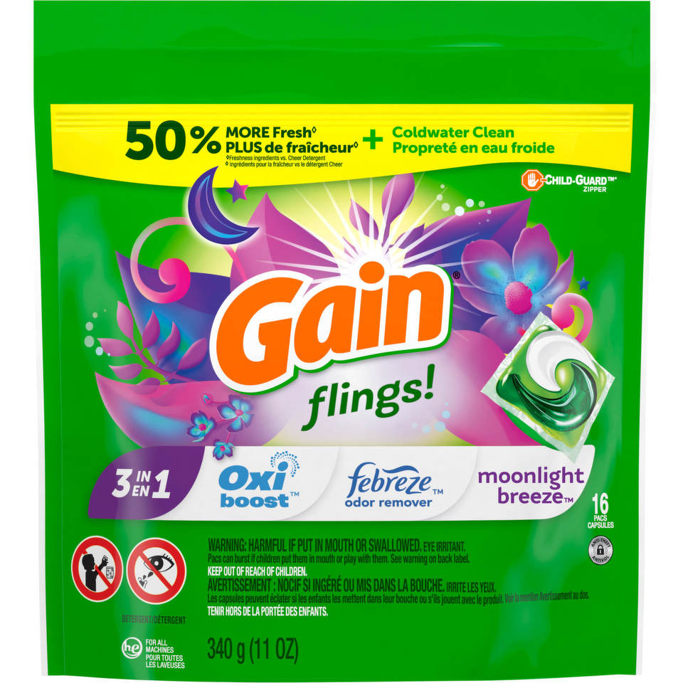 Venta al por mayor de paquetes de detergente 3 en 1 Gain Flings, suministro a granel de limpieza Premium con Oxi Boost y Febreze