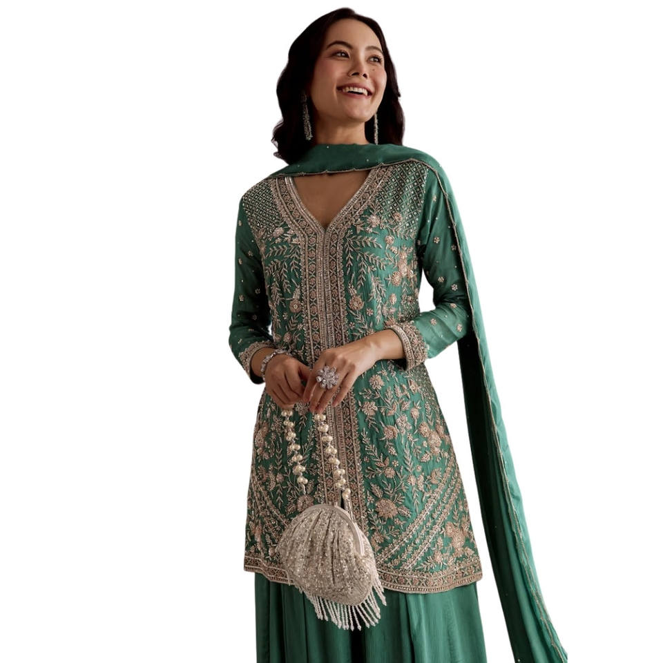 Venta al por mayor verde Chinon Cutdana bordado Kurta Palazzo traje para boda fiesta desgaste recepción festiva y pedidos étnicos personalizados