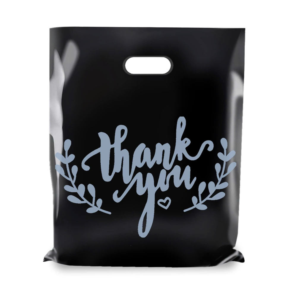 Venta al por mayor de bolsas de ropa de HDPE/LDPE con logotipo impreso gracias, bolsas de compras de plástico con asa troquelada, bolsas de regalo