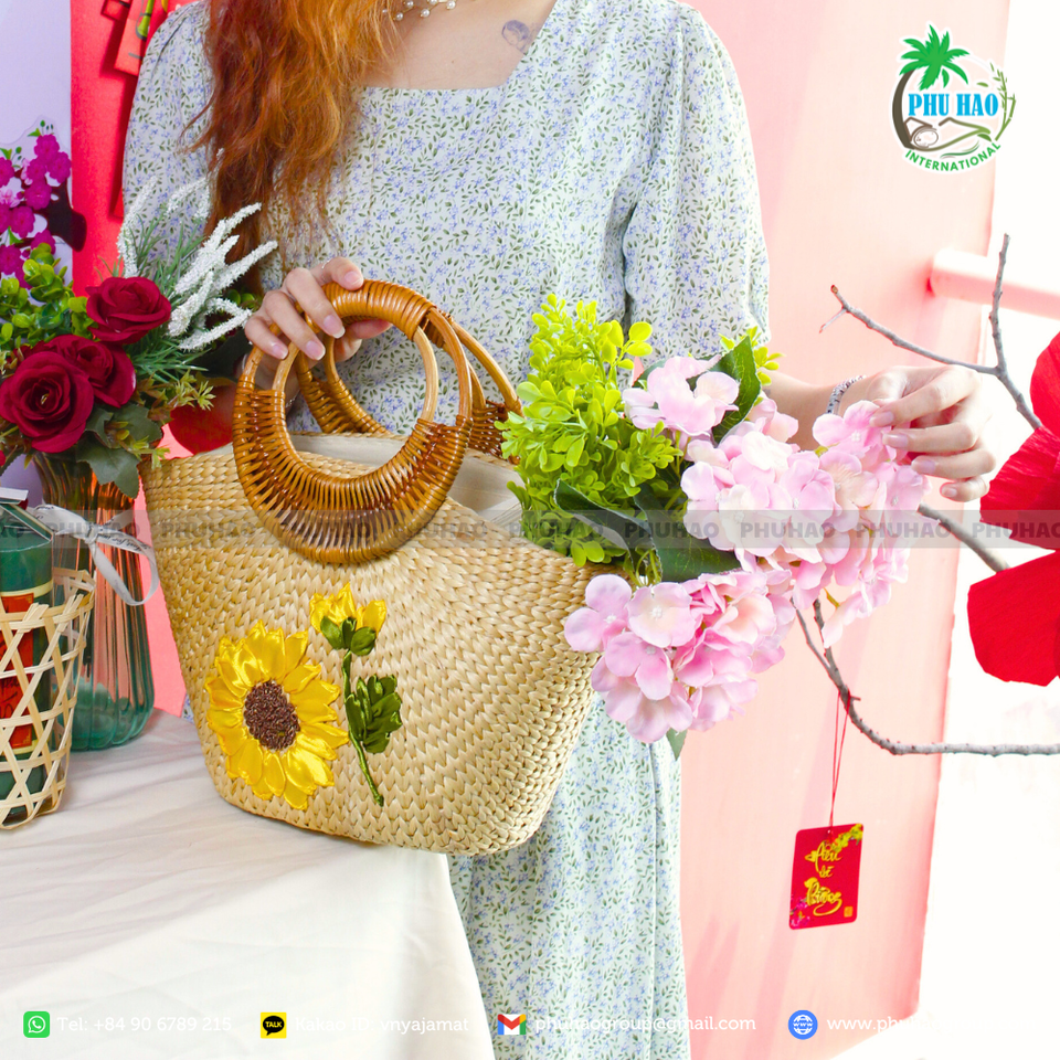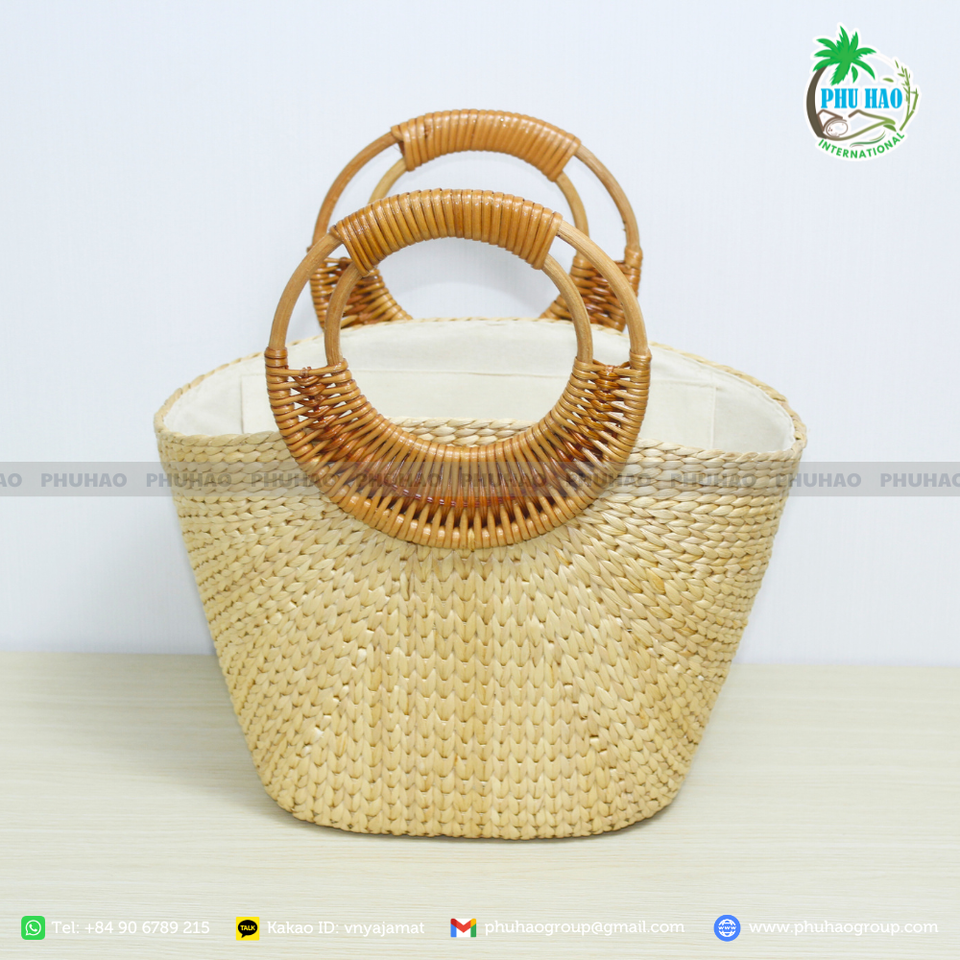 Venta al por mayor bolsas de jacinto de agua artesanales con asas de bambú ideales para los mercados minoristas de moda y de regalos