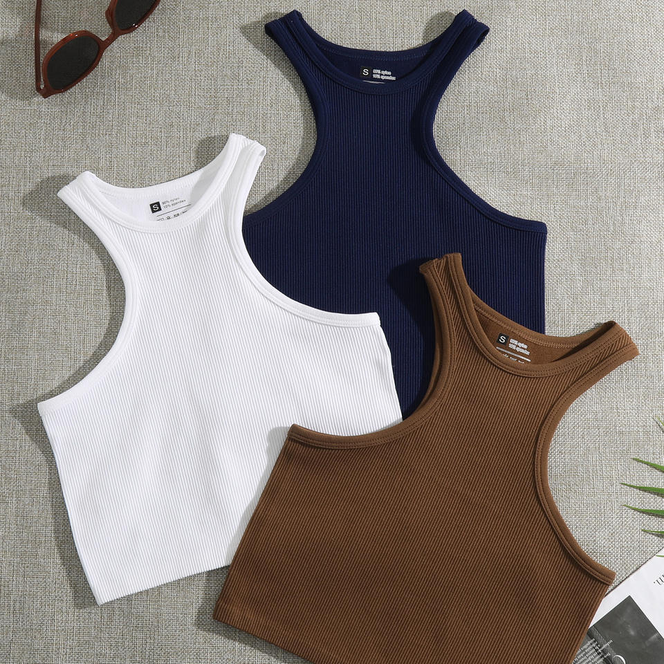 Chaleco sin Mangas de Punto Elástico de Color Sólido al por Mayor, Top Corto Sexy Ajustado de Secado Rápido para Mujer