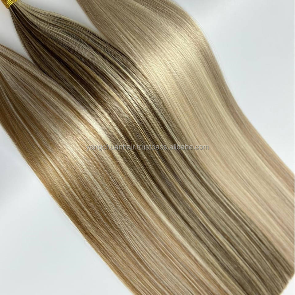 Venta al por mayor de extensiones de cabello humano de alta calidad de pelo virgen ruso de punta plana máquina de ondas naturales de trama doble todos los colores adecuados