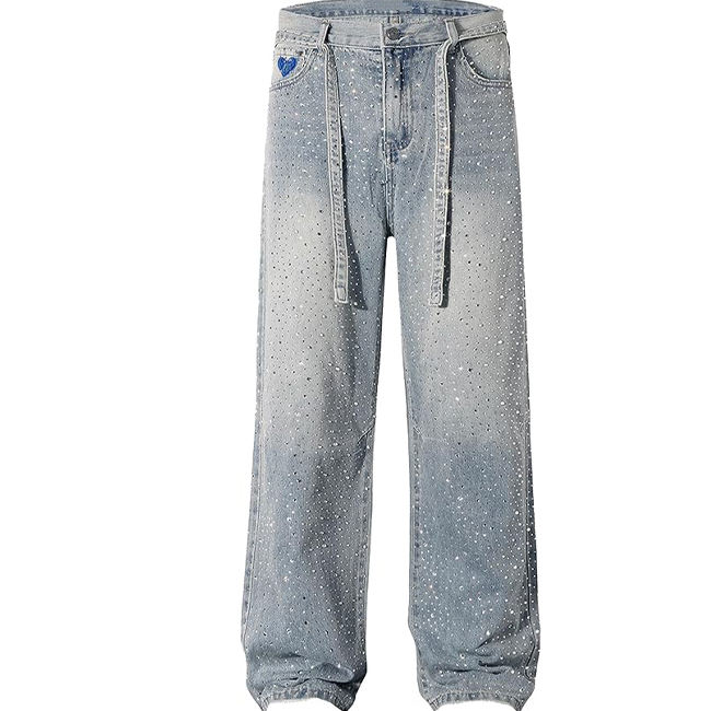 Palabras clave:Pantalones de mezclilla de calle con logo personalizado para mujer, con pedrería y corte holgado.