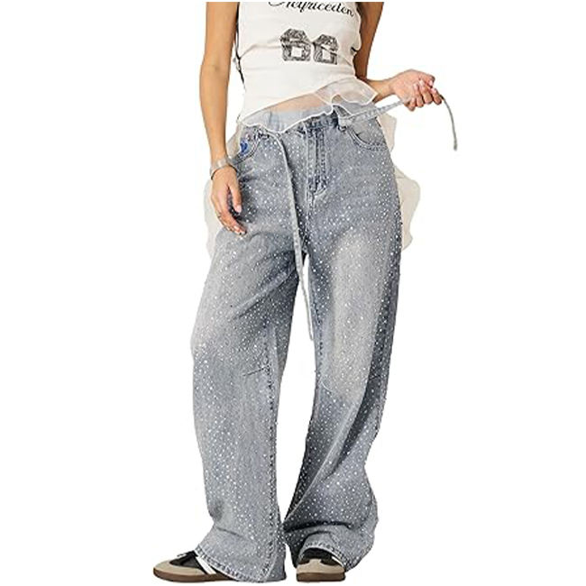 Nombre del Producto:Pantalones vaqueros de mujer personalizados con pedrería, corte holgado y estilo oversize.