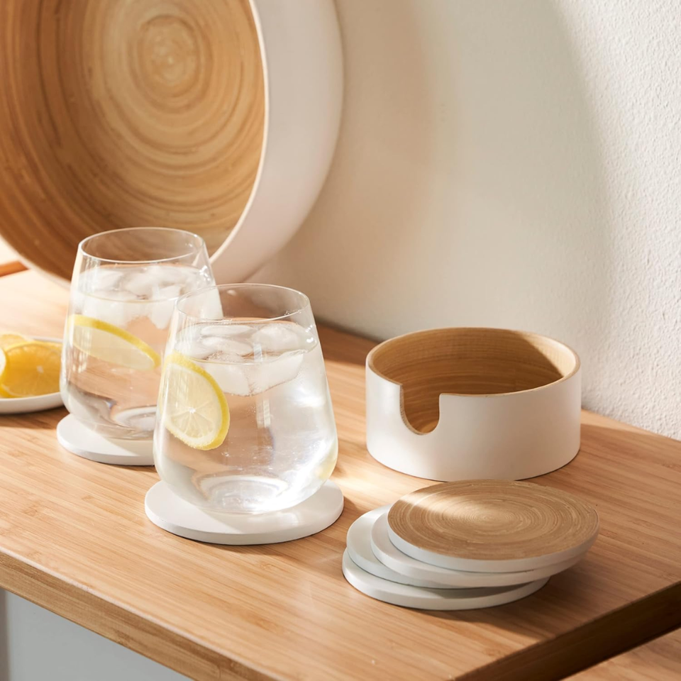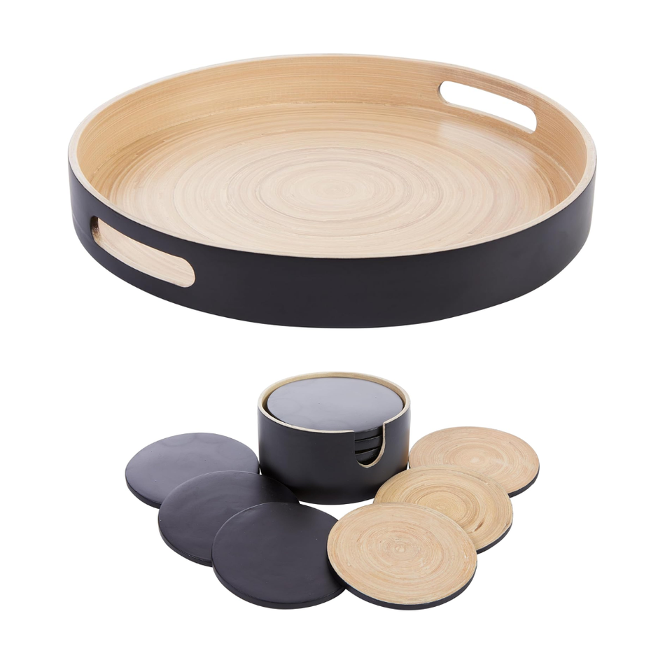 Product name:Set of Round Spun Bamboo Serving Tray with Coasters & Holder