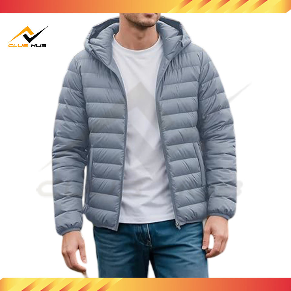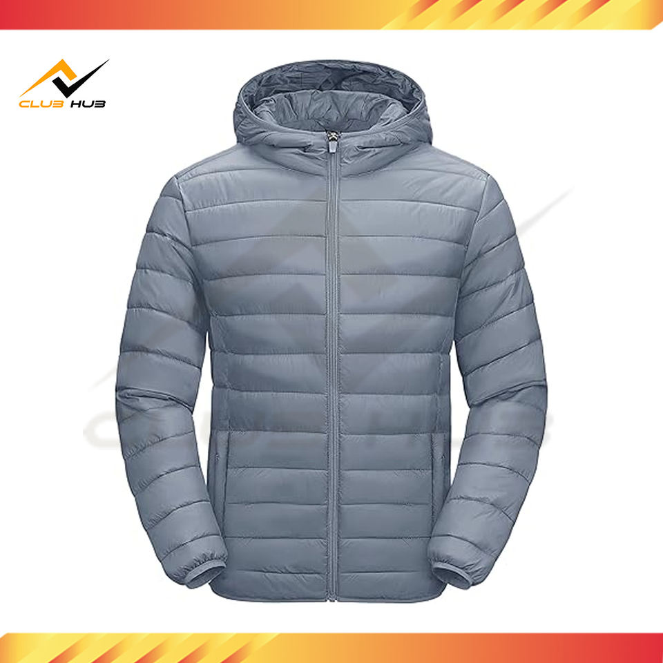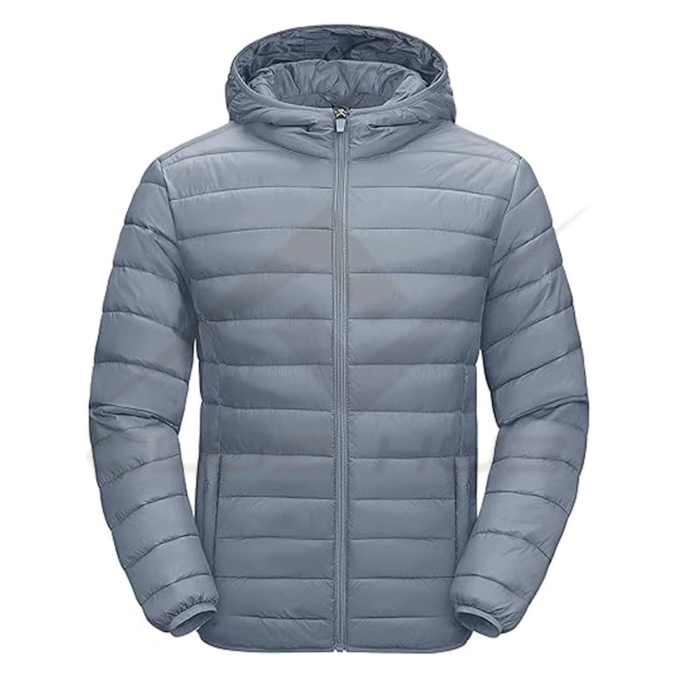 Chaqueta acolchada ligera gris claro de alta calidad al por mayor con capucha, fabricante de prendas de vestir exteriores resistentes al agua en Pakistán