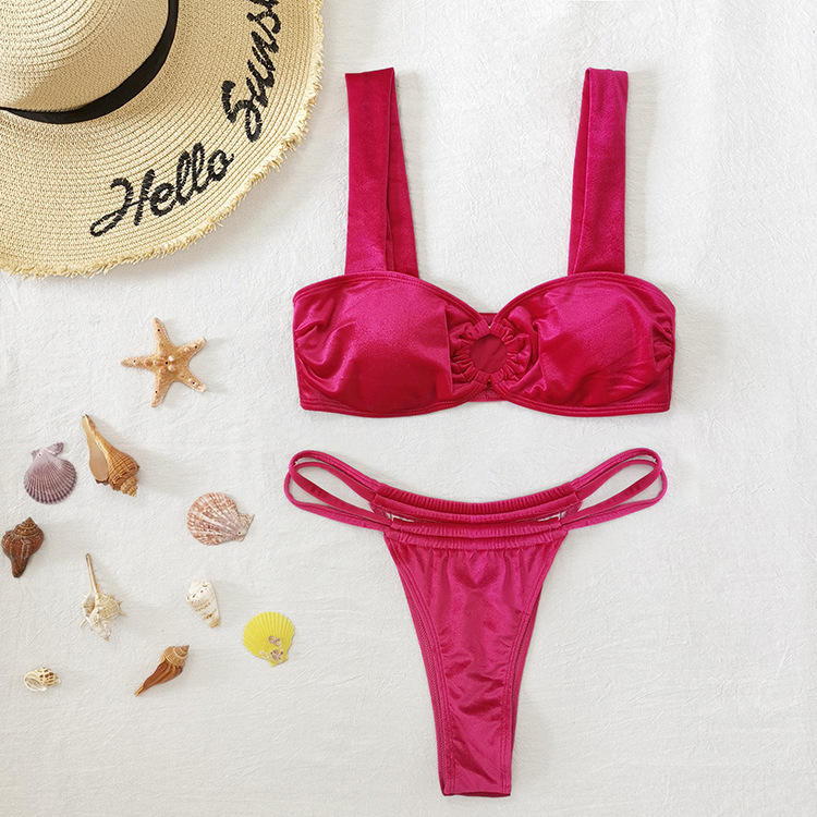 Venta al por mayor de alta calidad nuevo aro decorar diseñador Sexy terciopelo tela Rosa ropa de playa Bikini conjunto de dos piezas para mujer chica