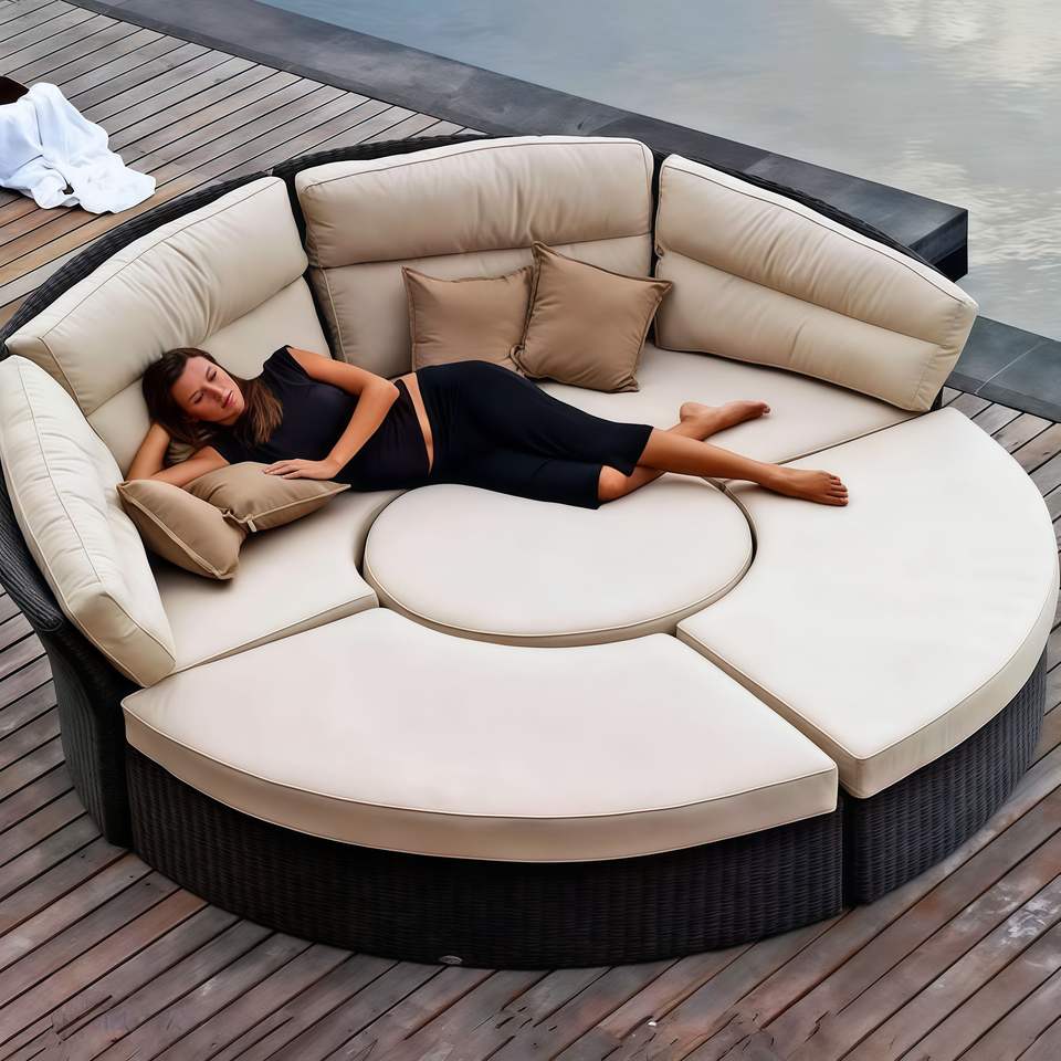 Venta al por mayor de alta calidad PE ratán impermeable playa desmontable redondo tumbona con dosel jardín Patio piscina