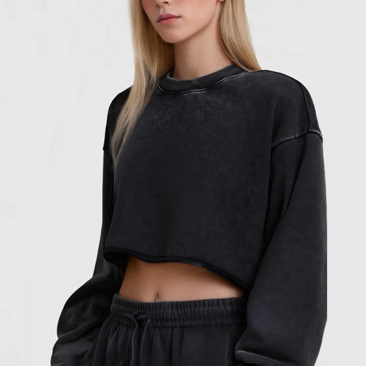 Venta al por mayor de alta calidad pulóver de primavera personalizado lavado ácido de manga larga de gran tamaño 100% algodón mujeres recortadas sudadera