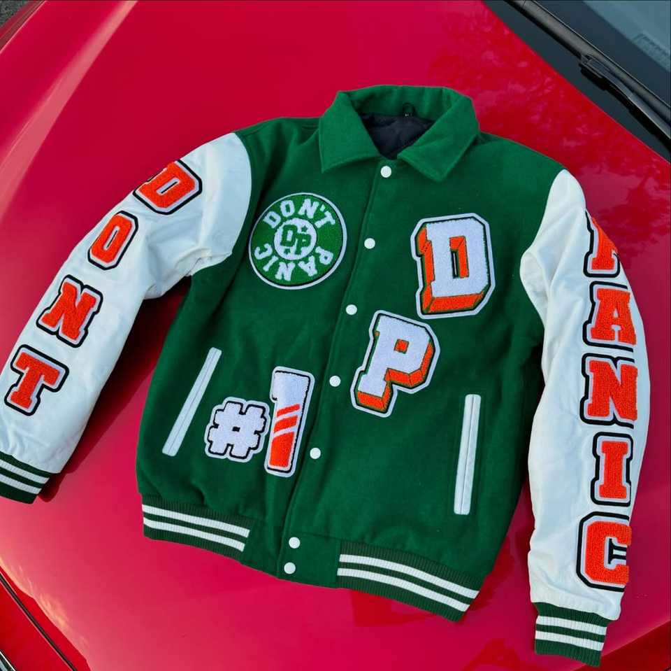 Palabras clave:Chaqueta tipo letterman con mangas de cuero.