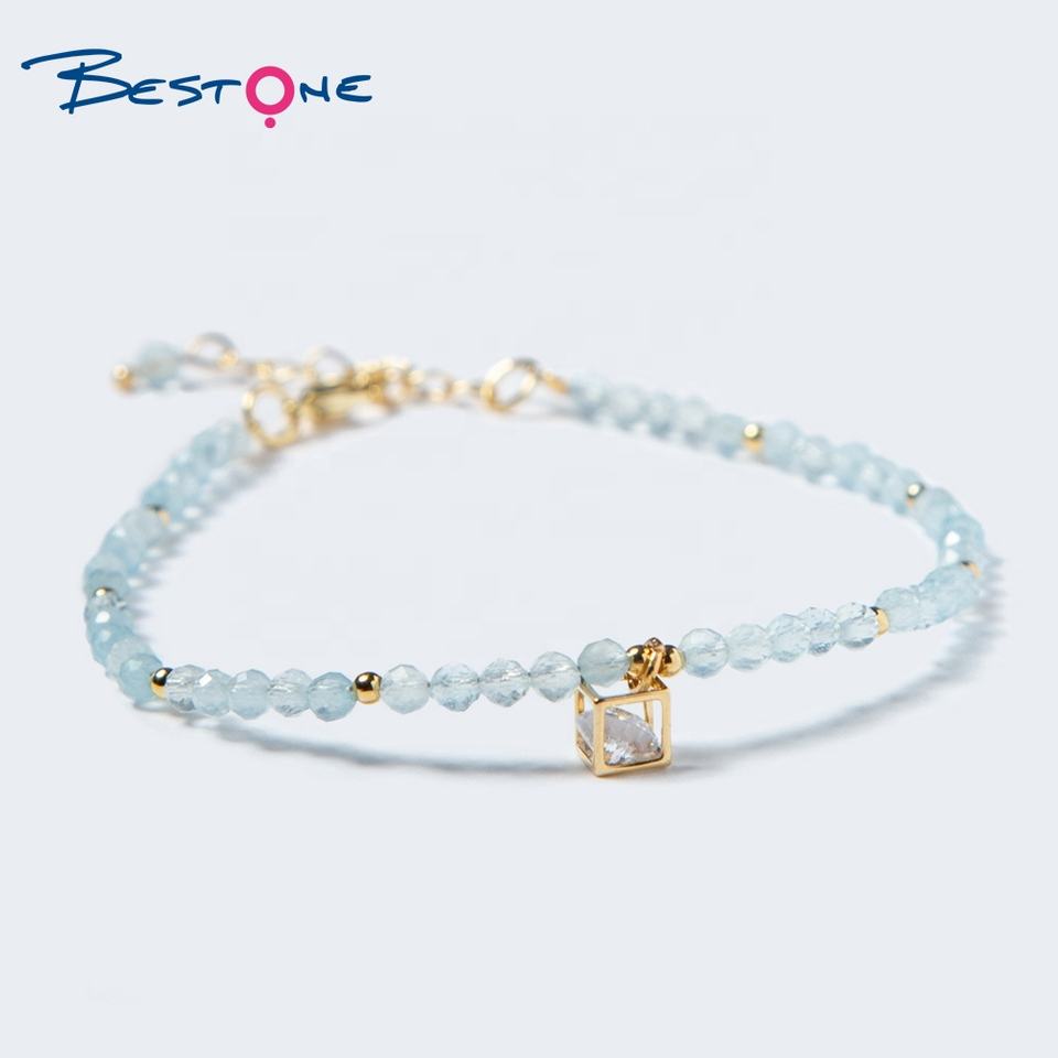 Venta al por mayor de gran oferta de joyería personalizada chapado en oro encanto cuentas de piedra natural aguamarina pulsera para las mujeres