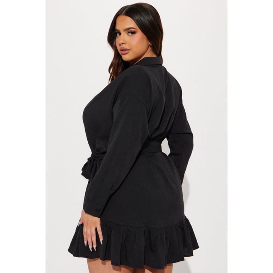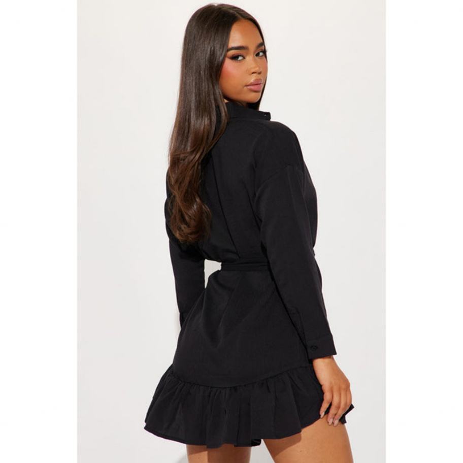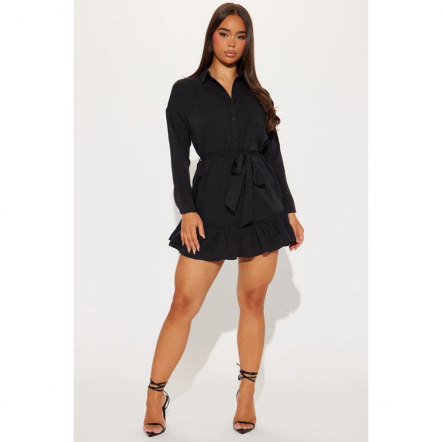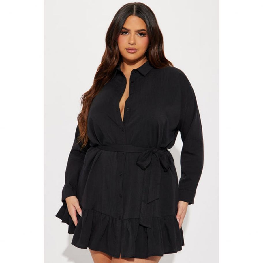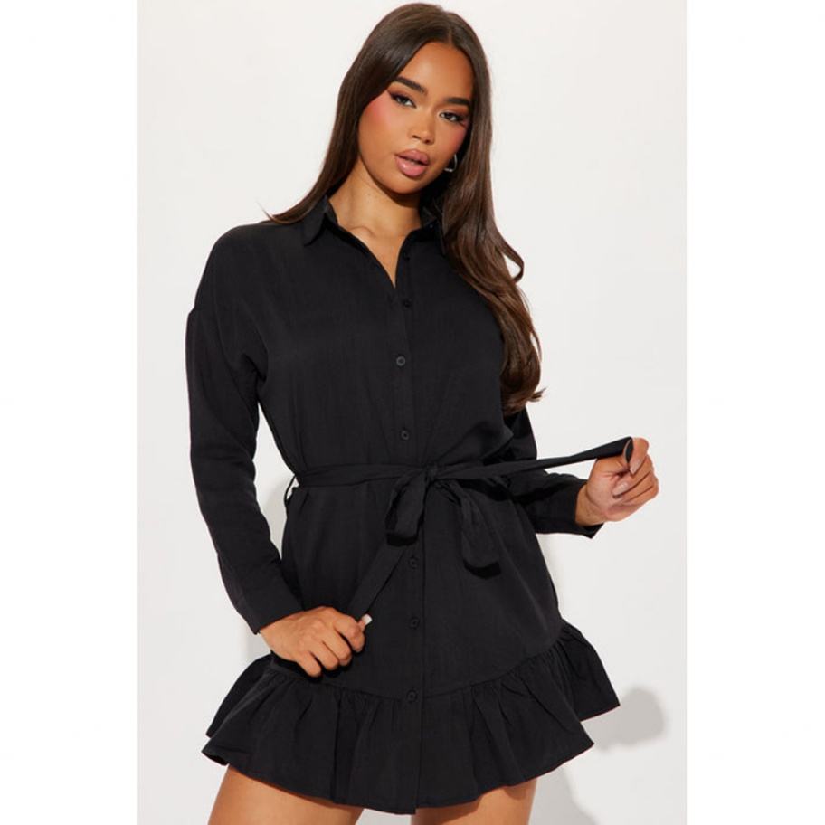 Vestido Mini Camisero Holgado de Color Liso con Solapa, Estilo de Moda, Versátil y con Efecto Arrugado, Venta al por Mayor